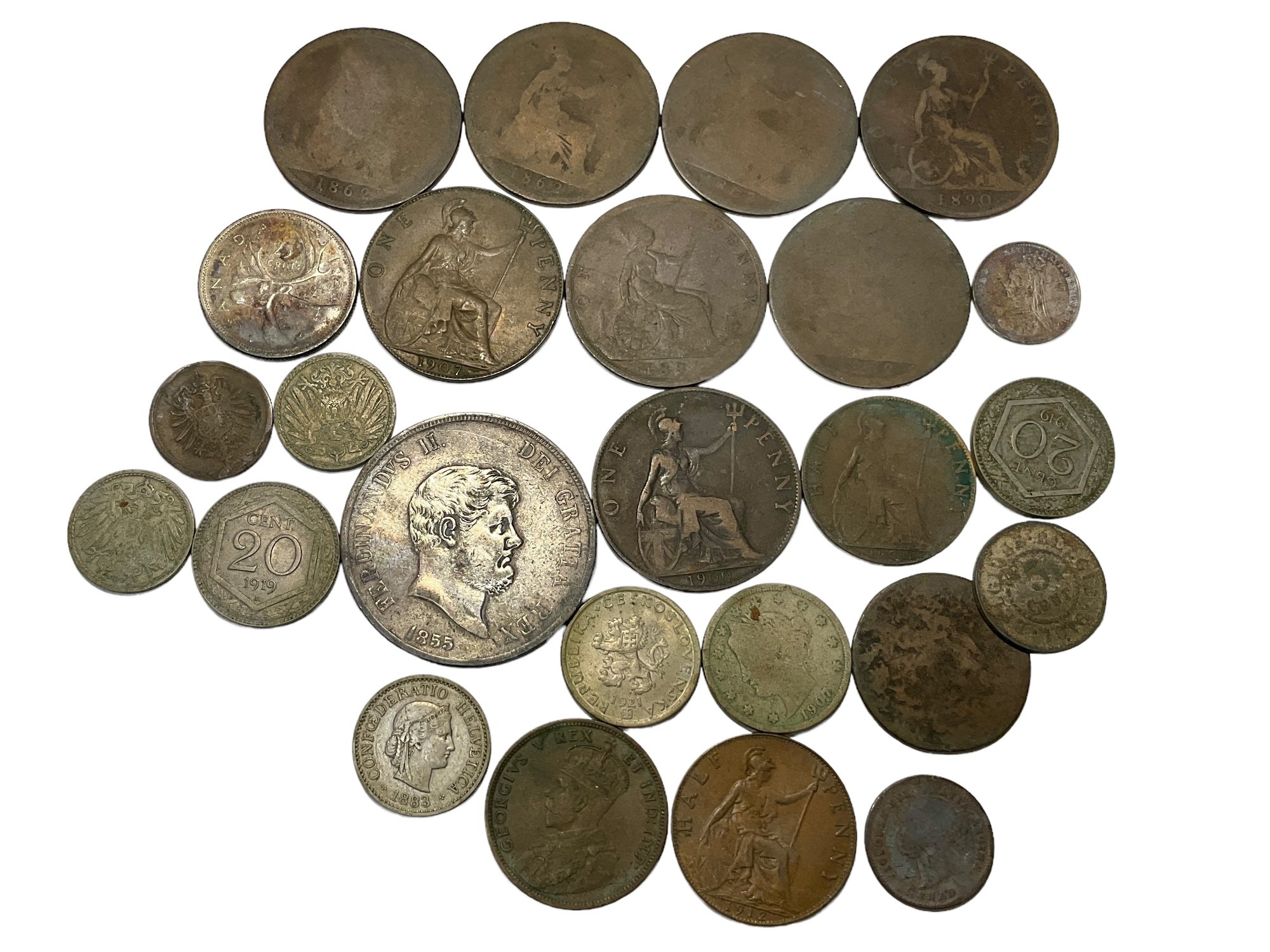 Lot Of Vintage And Antique Coins Foreign And National With Silver coins, including large Italian 1855 silver coin. Lot comes with small leather pouch that the coins were stored in, but it is quite disintegrated.