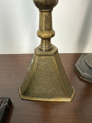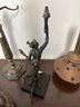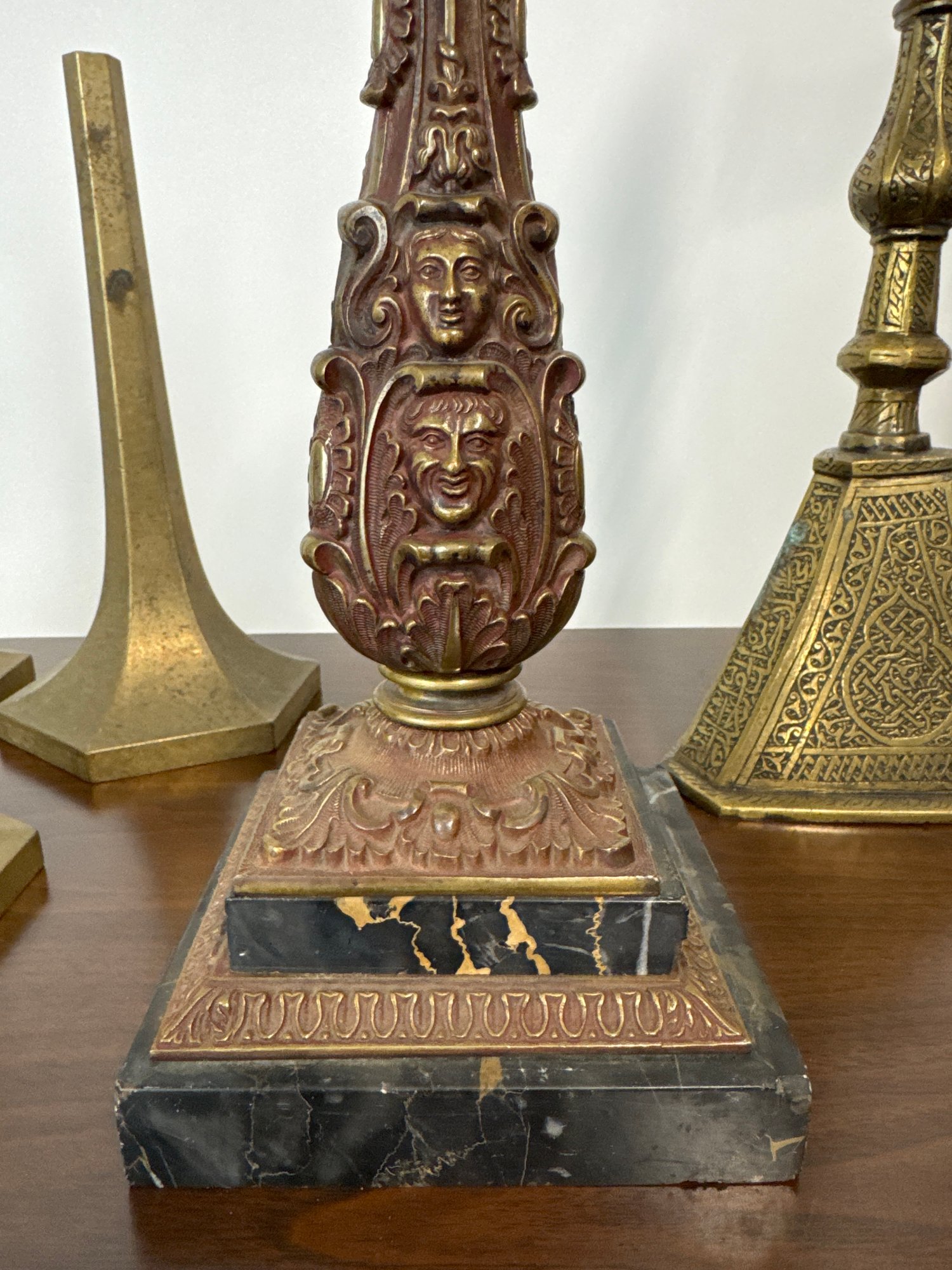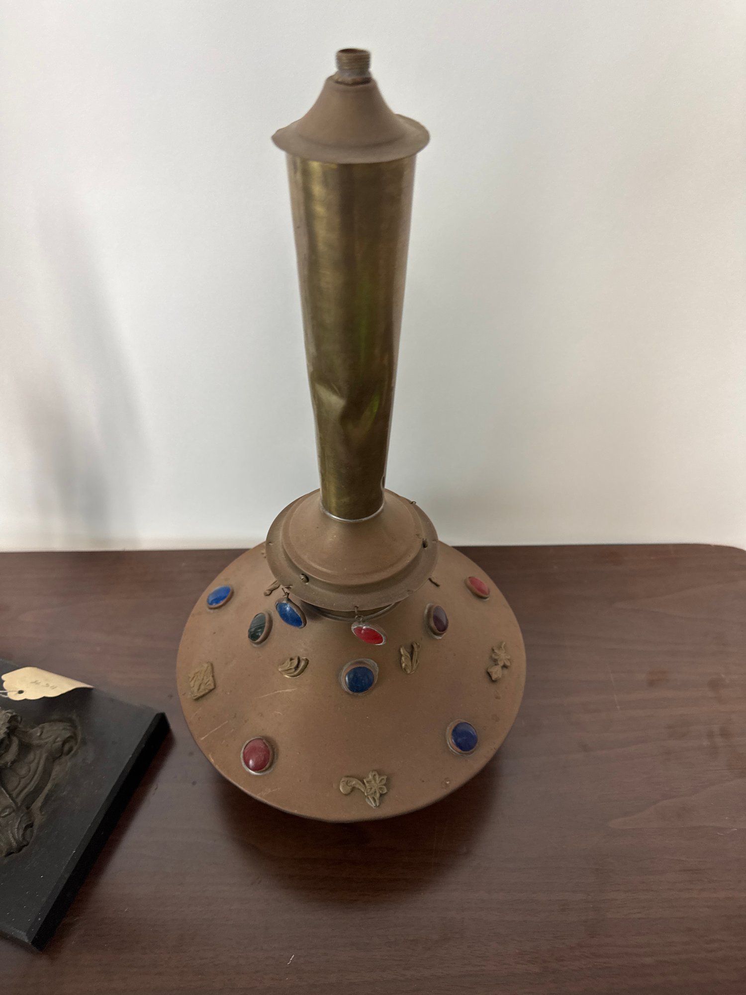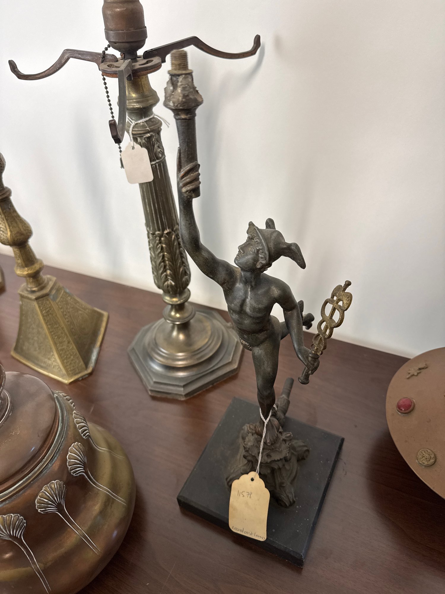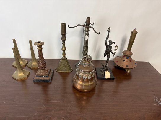 Lot Of Nine Brass Bronze, Metal Lamp Basis - As Found Condition. The front copper lamp with the shell pattern is reputed to be a Tiffany piece, but it is not marked, so make of that what you will.