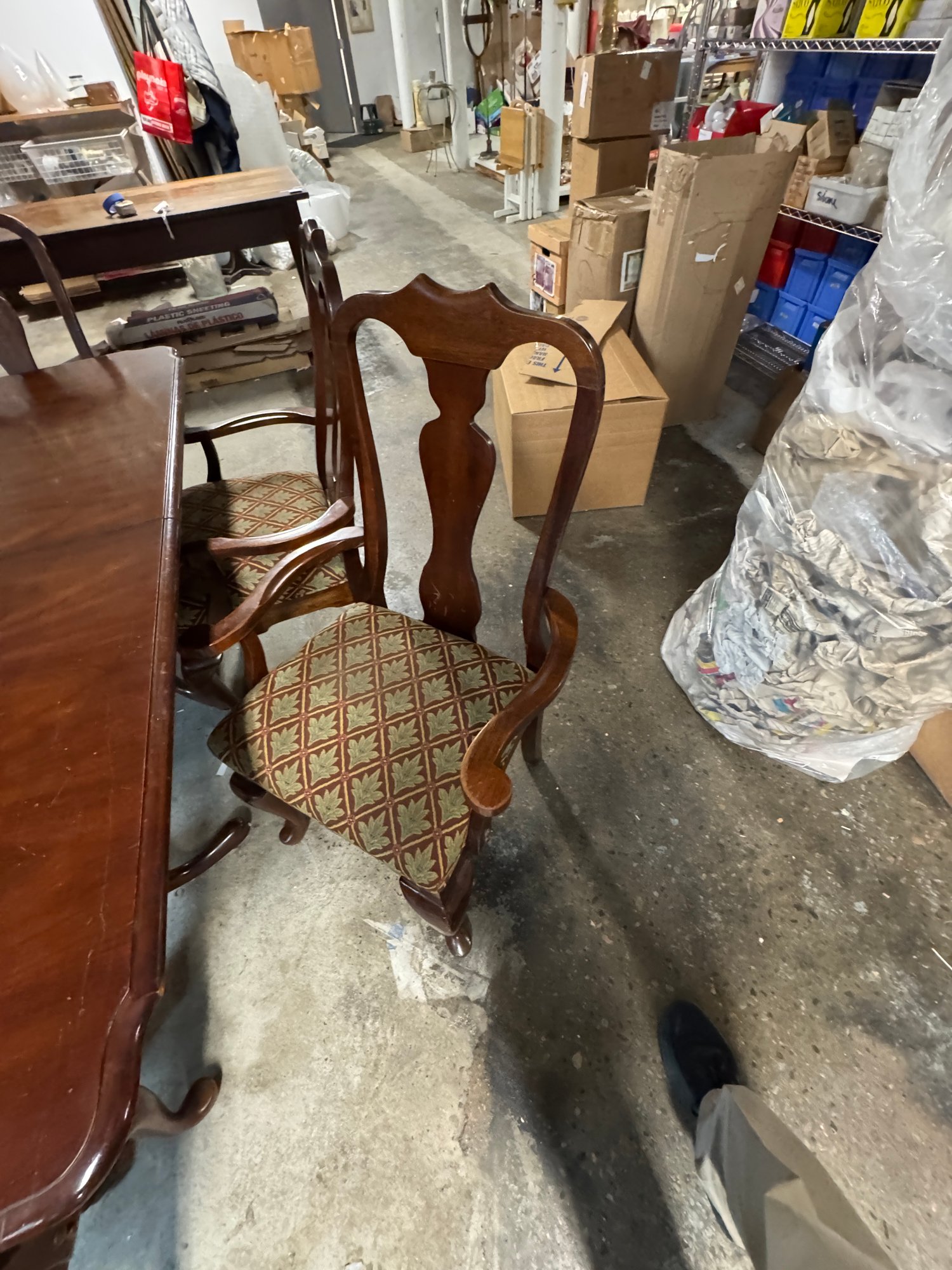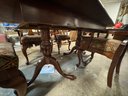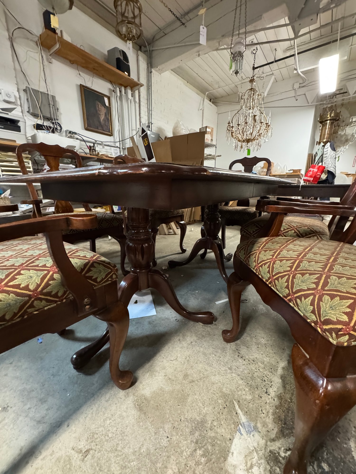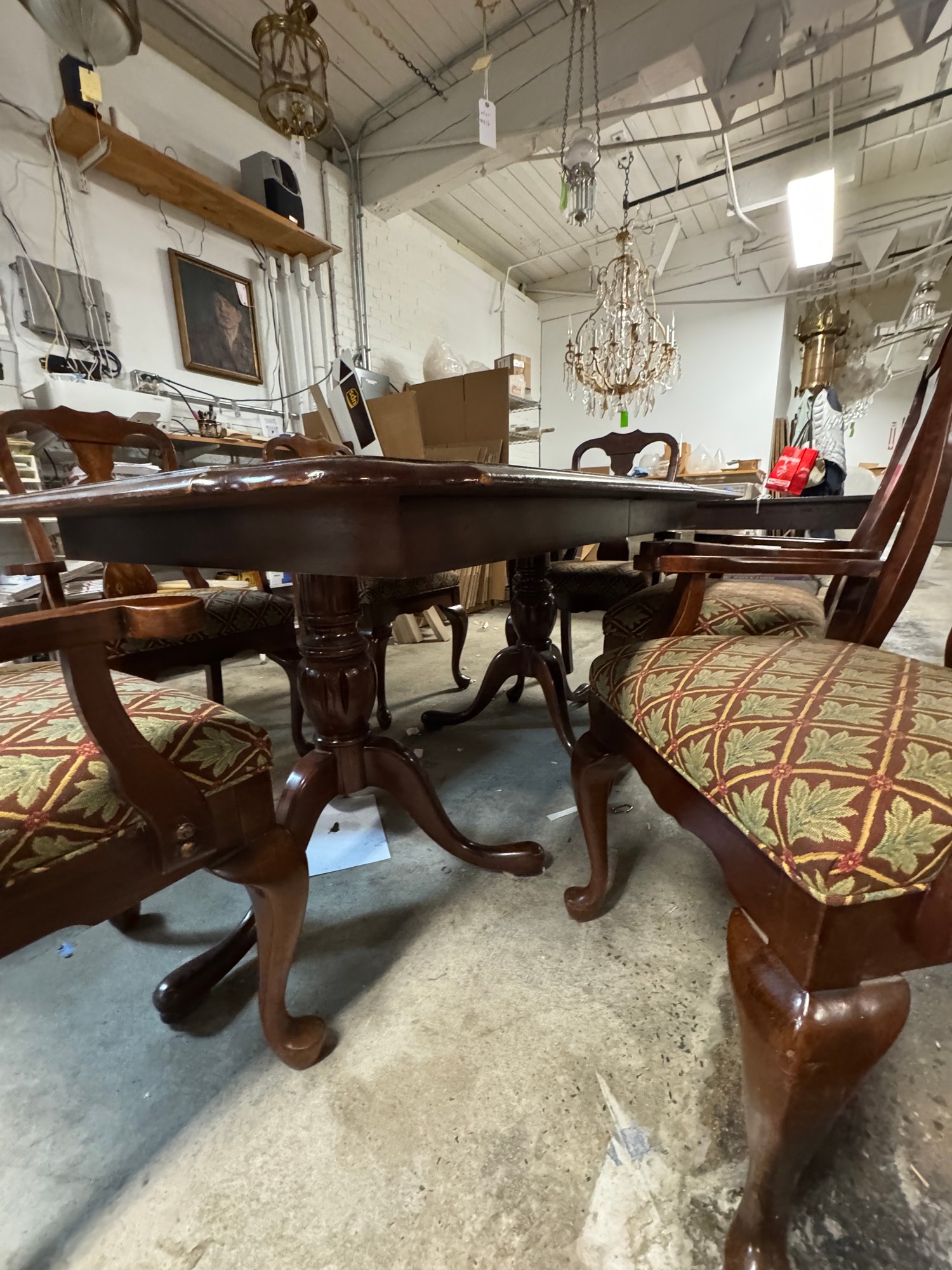 Mahogany Duncan Phyfe Style Dining Room Table with 6 Arm Chairs. This measures 65" long by 41" wide. And there are two 18" leafs to make 101 inches long. In as - found condition, some of the chairs need tightening up, the table appears sturdy, it was used here in the shop for quite a while.