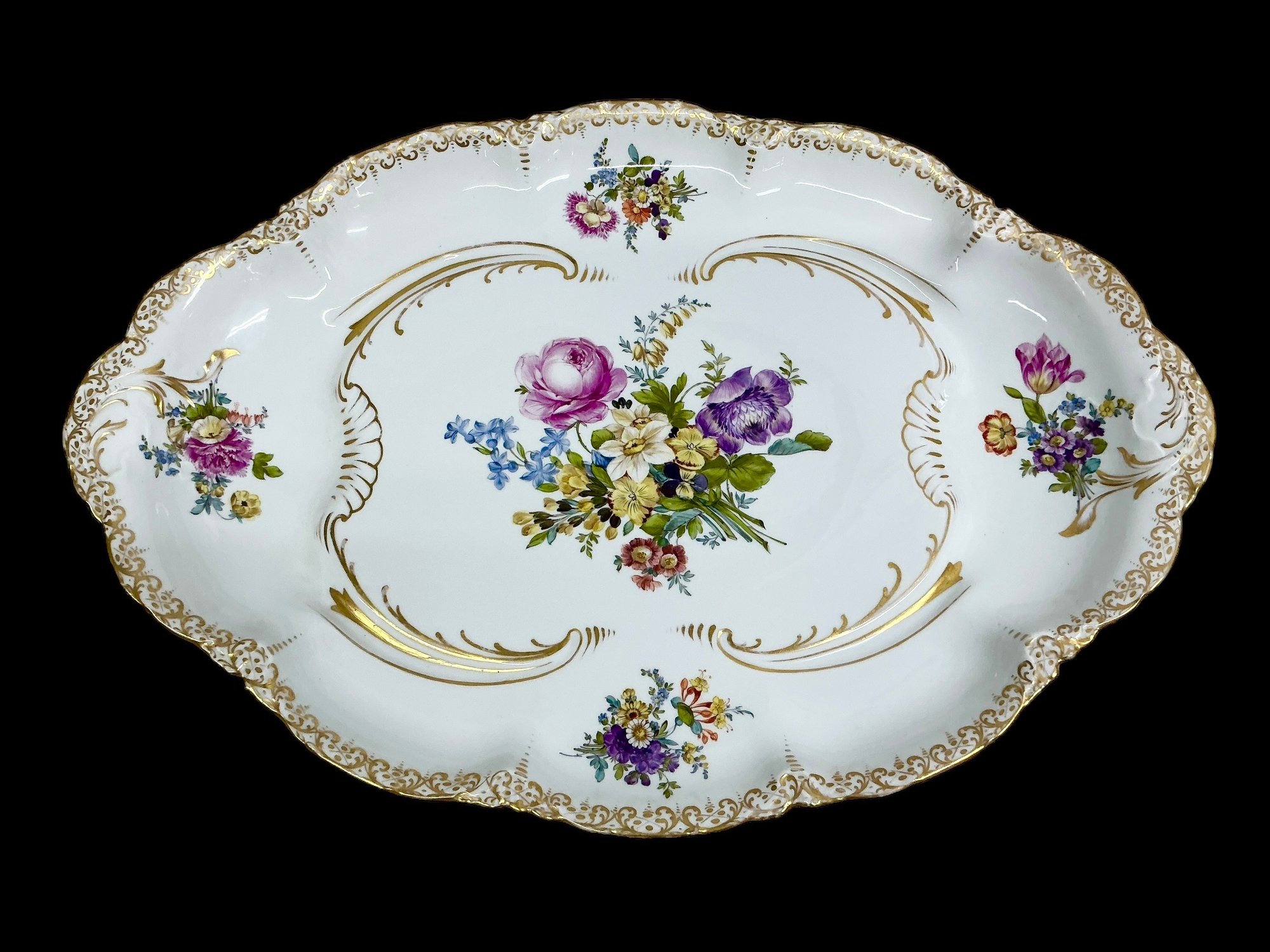 Massive Twenty Two Inch Antique Dresden Crossed Swords And Rose Mark Hand Painted Porcelain Tray. In good condition. It is approx. 22” by 15.”