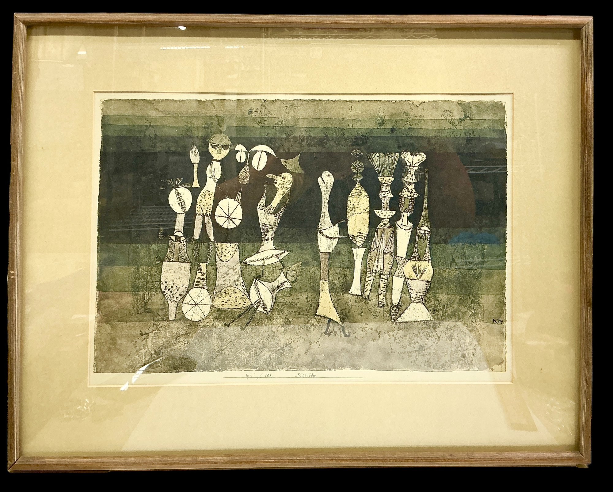 Mid Century Vintage Klee Print Komodie, measures 19” x 26” including the frame.