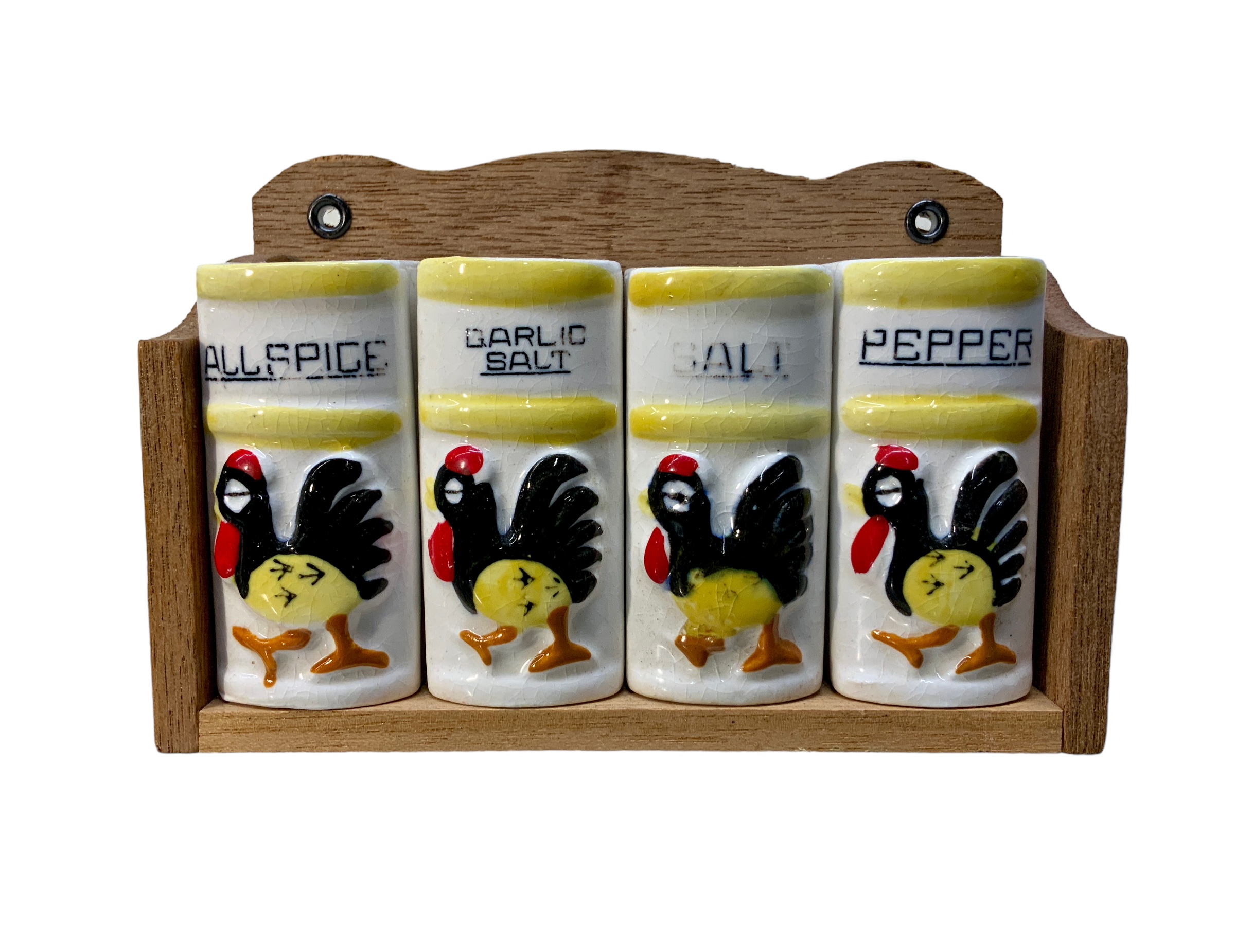 MIJ Vintage Bookshelf Salt, Pepper, Garlic Salt And Allspice Shakers, porcelain, on a small shelf. Measures 5.5” wide total.