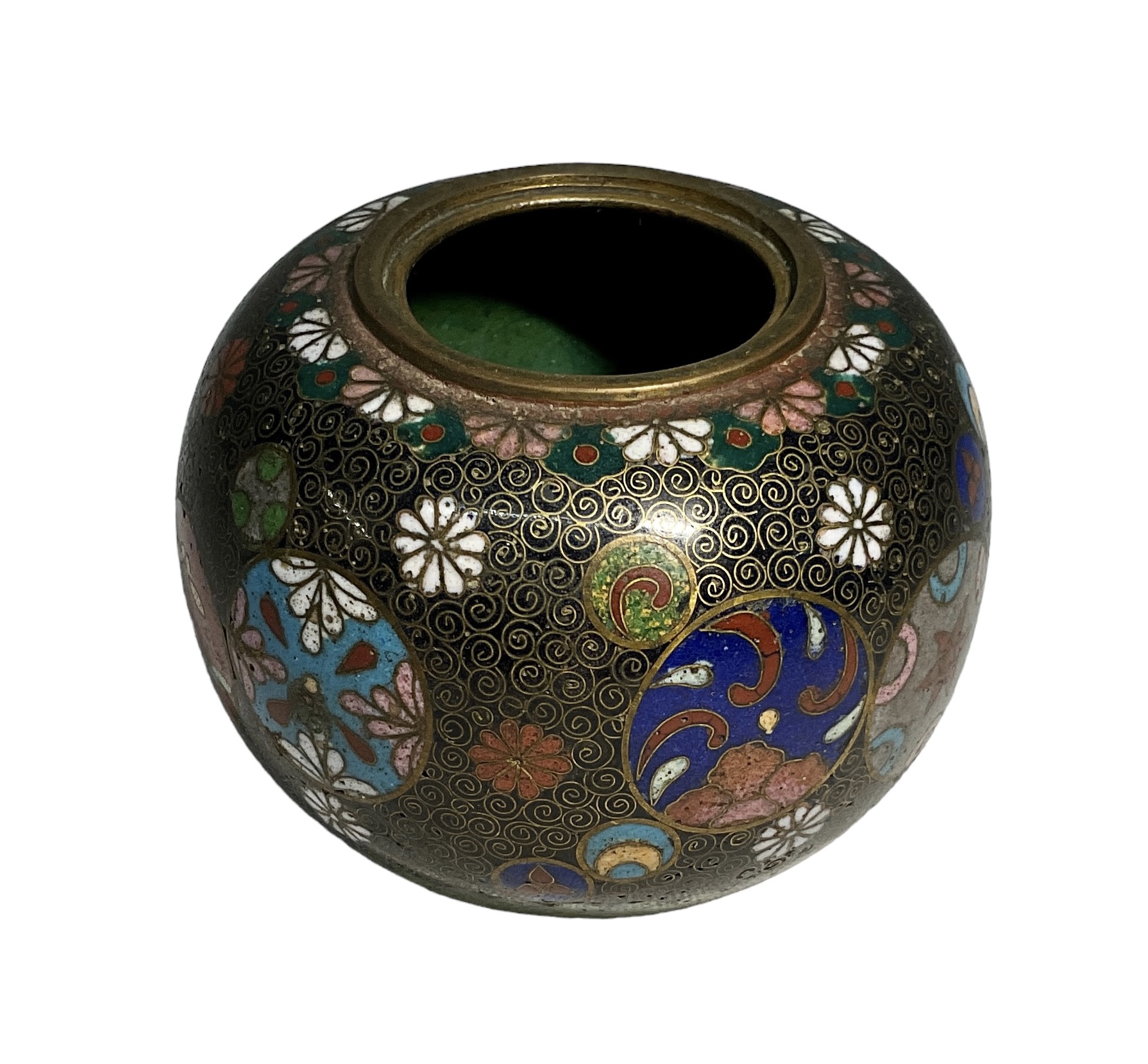 Little Footed Cloisonne Pot, measures 2.75 inches tall.