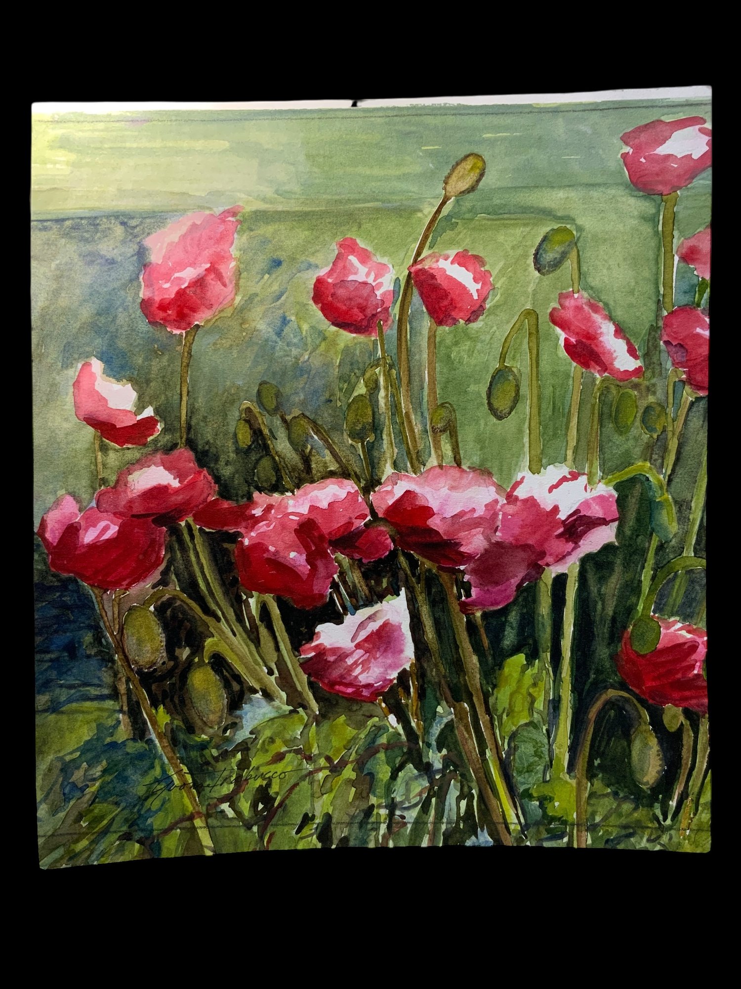 Poppies Watercolor Signed Yvonne Trabucco, unframed. Measures 11” x 10.”