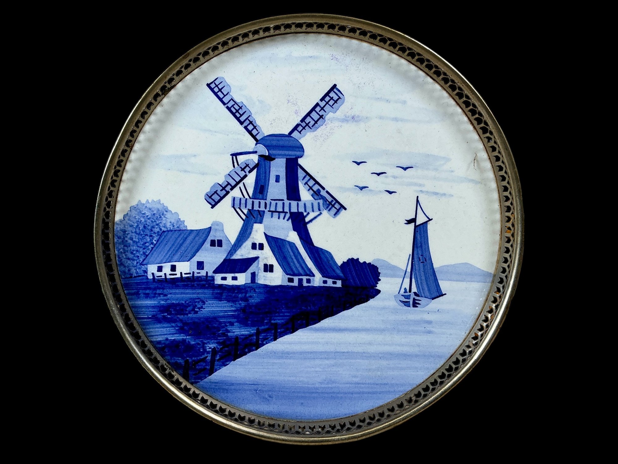Porcelain Delft Style Hand Painted Tray, measures 9.5” in diameter, no damage.