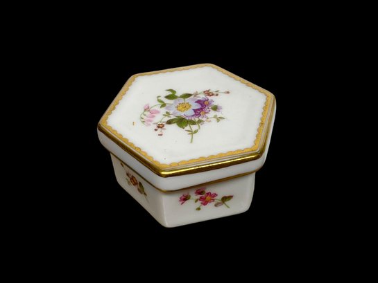 Porcelain Royal Crown Derby Small Pill Box, measures 1.5” wide. No damage.