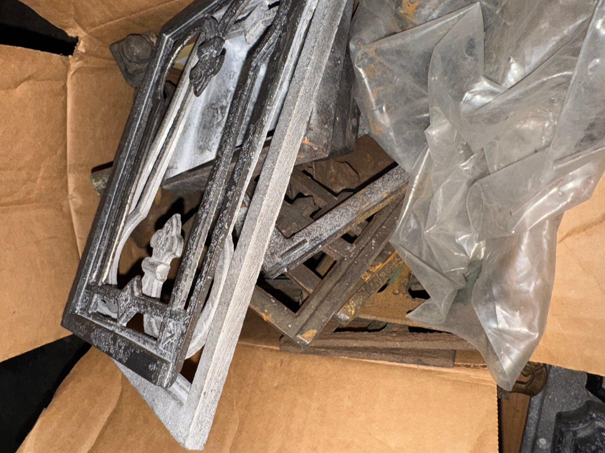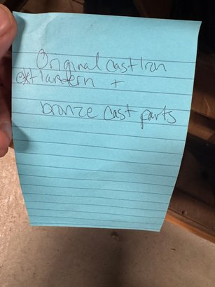 Original Cast Iron Exterior Lantern and Cast Bronze Parts. We're selling in bulk here, so there are no guarantees, what you see on the shelf is what you get. The blue note was written by the owner, and we assume that's what's there!