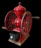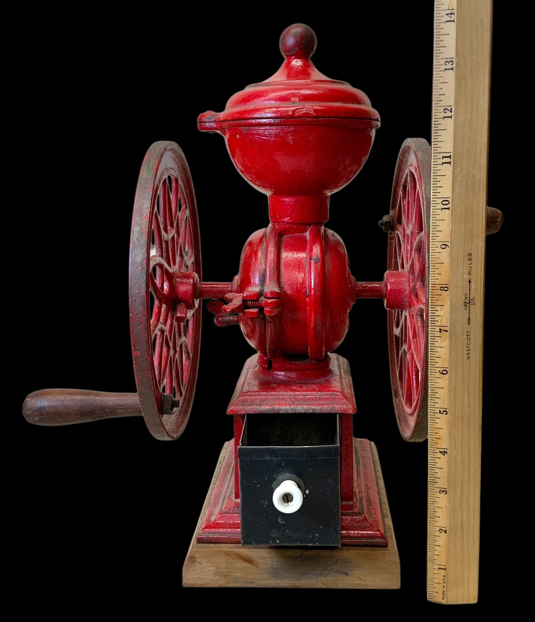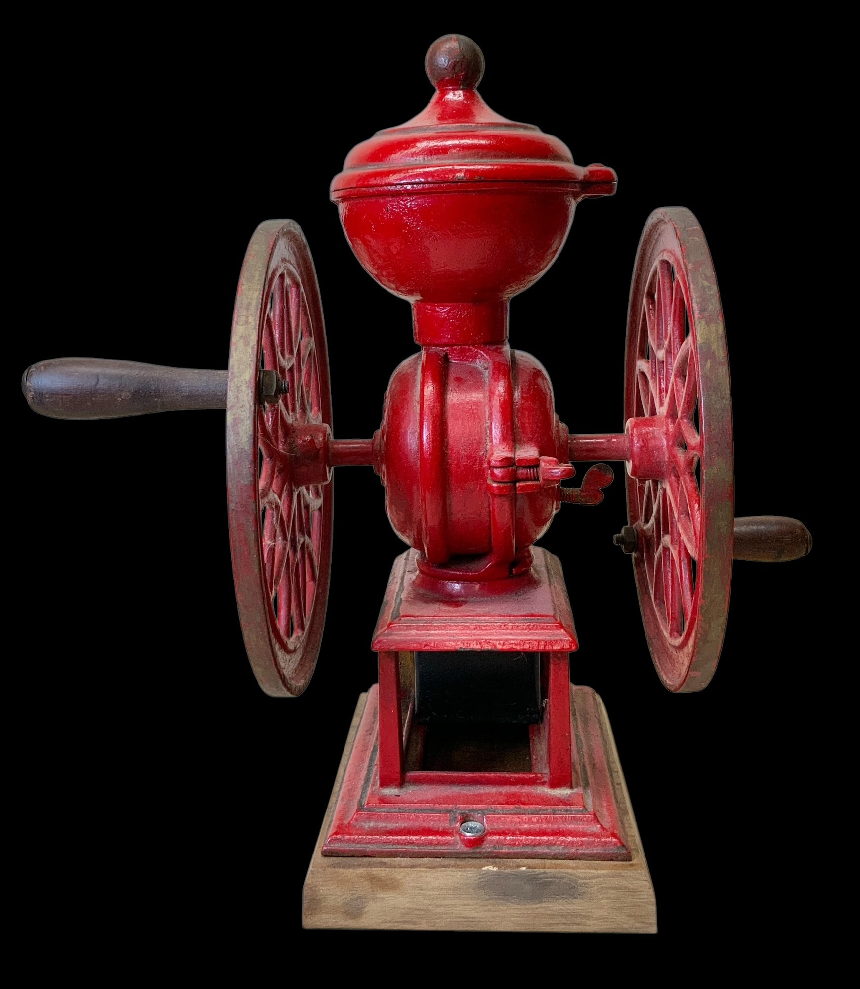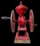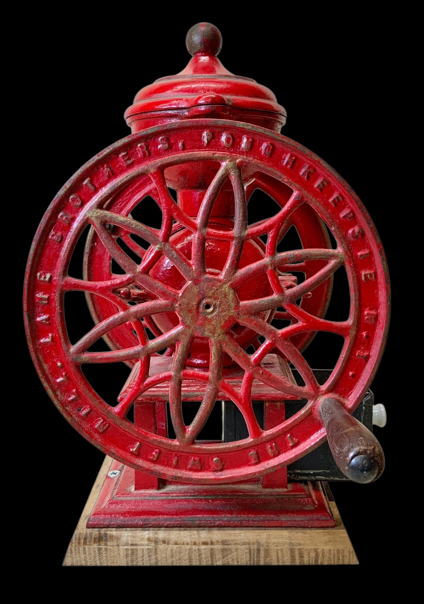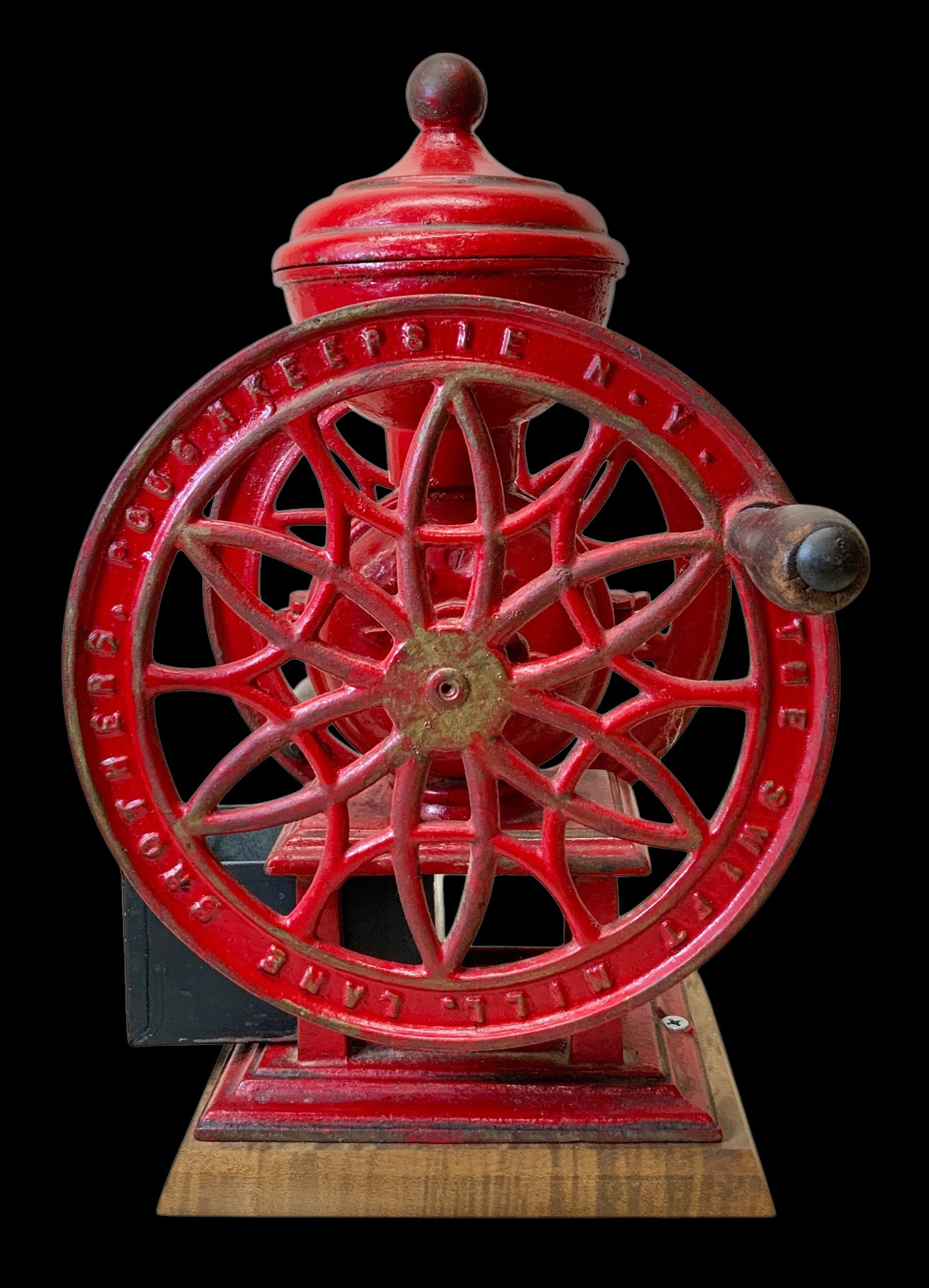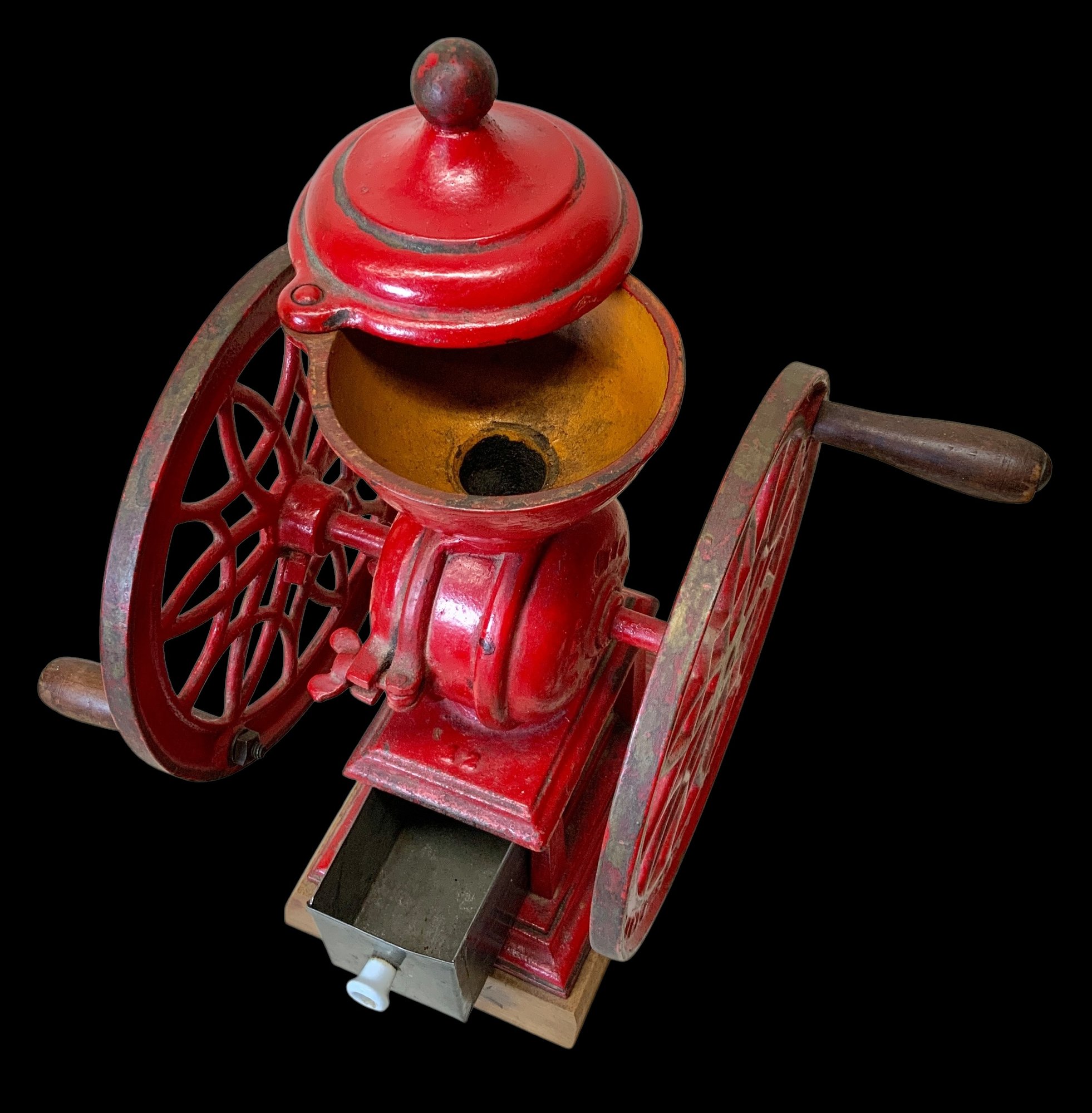 Rare Antique Swift Mill Lane Brothers Cast Iron Coffee Grinder. Manual cast iron coffee grinder hand-painted in bright red, with an iron drawer. Top is on a hinge that slides open and closed. No visible cracks or chips, please see photos for more details. Measures approximately 14.75” high and 5.75” wide at the wooden base. Extremely heavy.