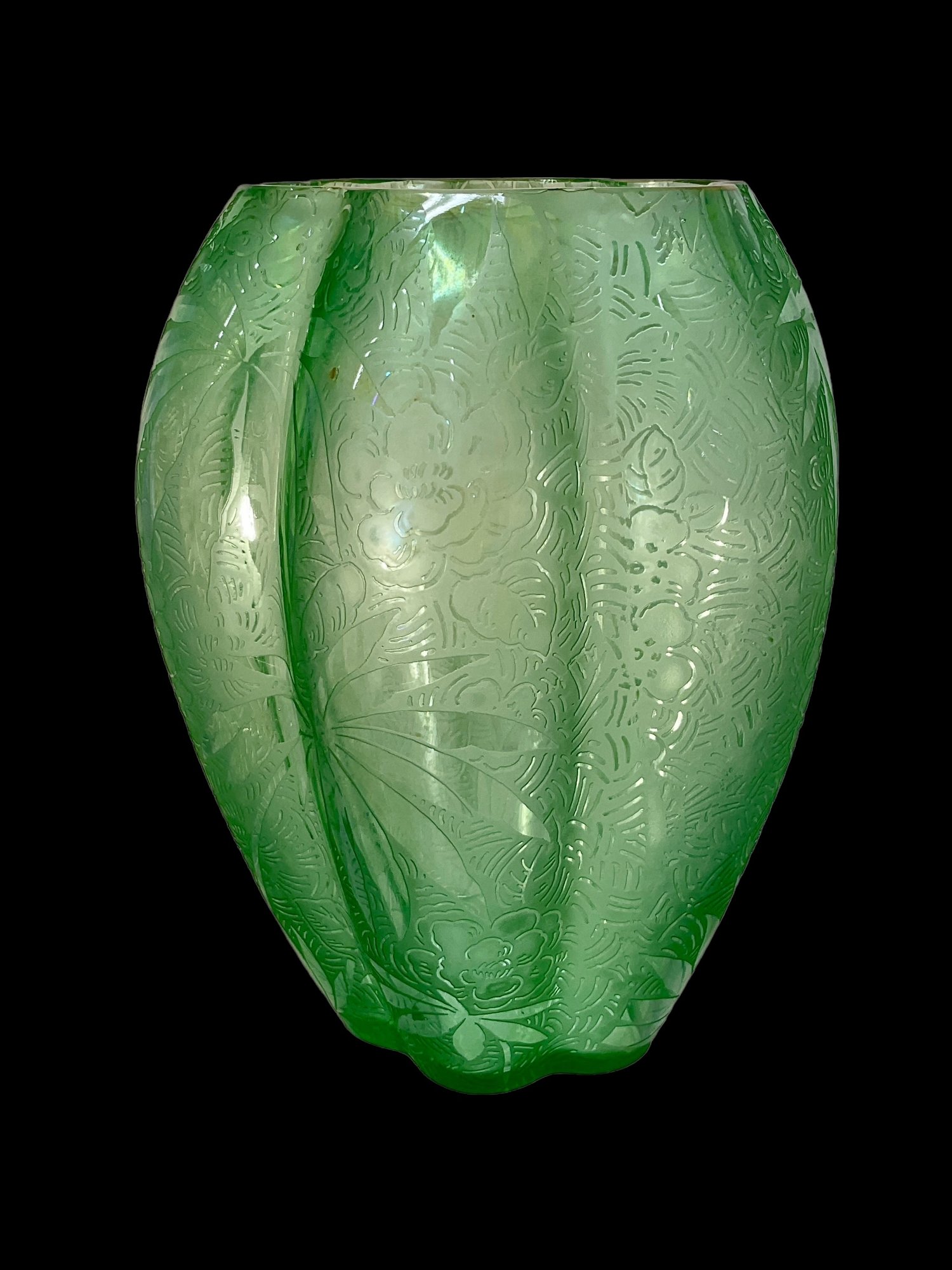 Iridescent Etched Art Glass Green Vase Palm And Flower Art Deco Motif, measures 8.25” tall, a possible flea bite or flaw on the rim, see photos, otherwise no chips or cracks.