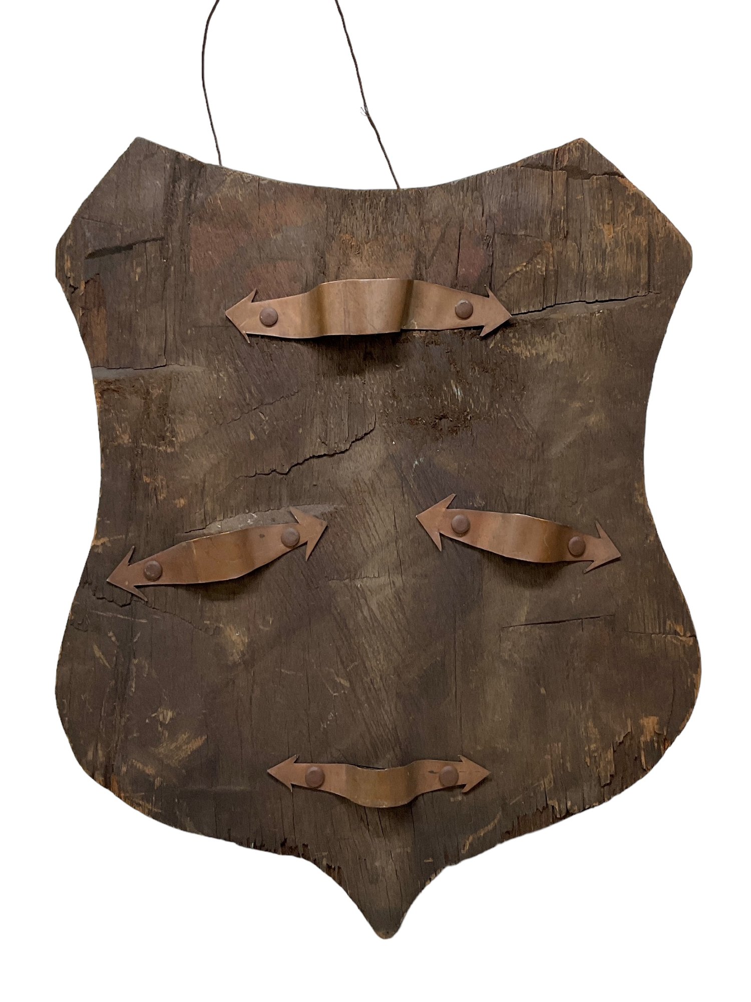 Primitive Shield Shaped Knife Or Tool Holder, measures 17” tall. Appears to be handmade.