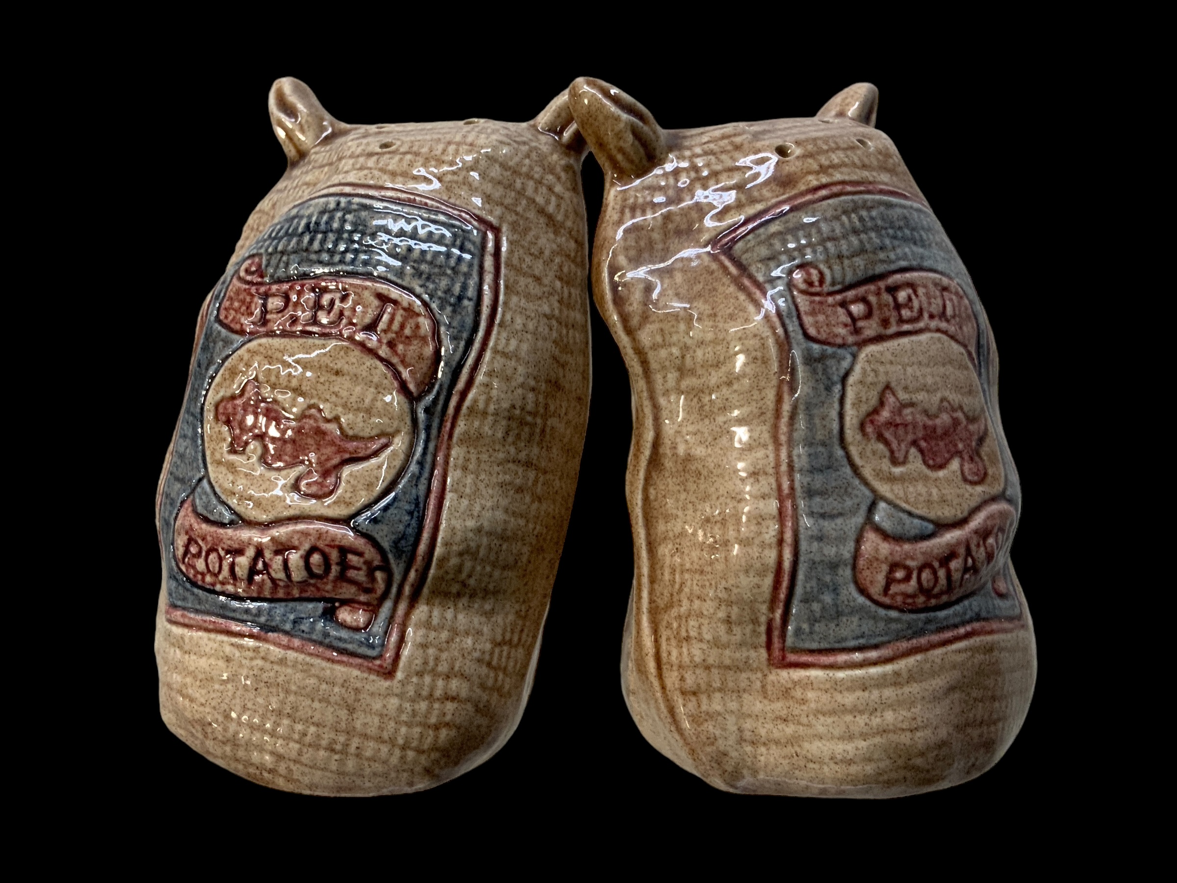 Prince Edward Island Potatoes Ceramic Salt And Pepper Shakers, hand made in PEI. No damage, 3” tall.