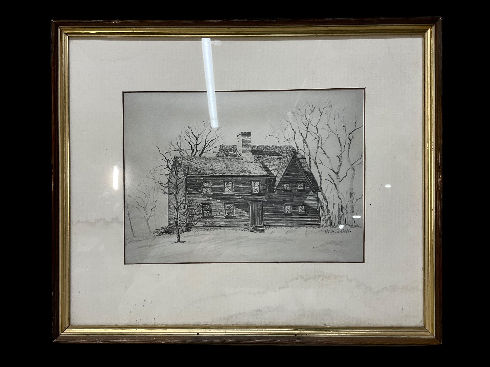 Print Of Old New England House By W.A. Shaw, please note, the matte that this is framed with has water damage. See photos. Sight size is 7.5” x 10.5.”