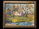 Ruth C Hagstrom Oil Painting Landscape On Canvas, measures 10.5” x 13.5.” Signed RC Hagstrom by the artist. Lovely colors and ducks in foreground. Includes envelope with news article on the artist.