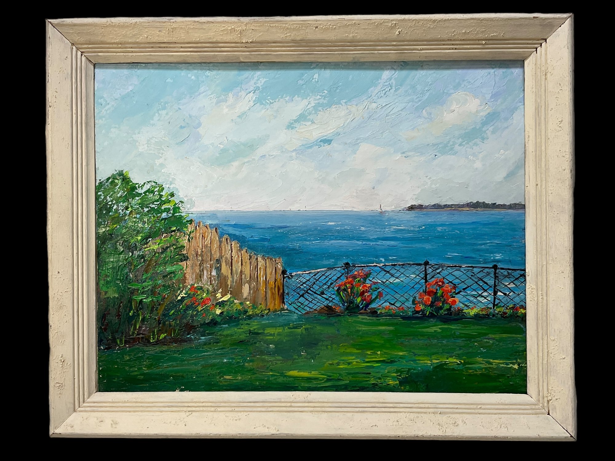 Serenity Painting On Canvas Board By Dolorosa Mrs George Davidson, measures 14” x 18.” This has the texture of oil paint, but might be acrylic, we are not sure.