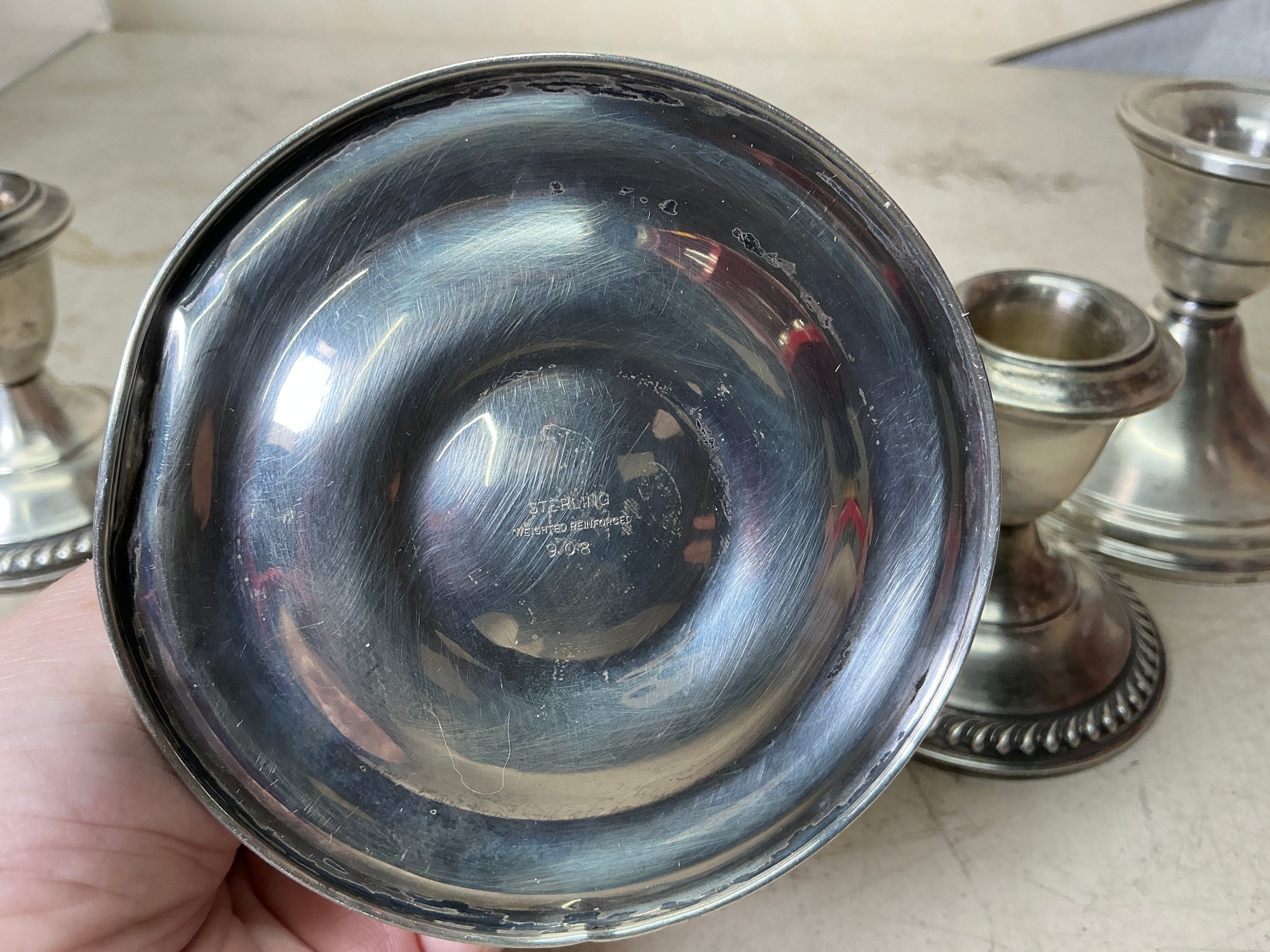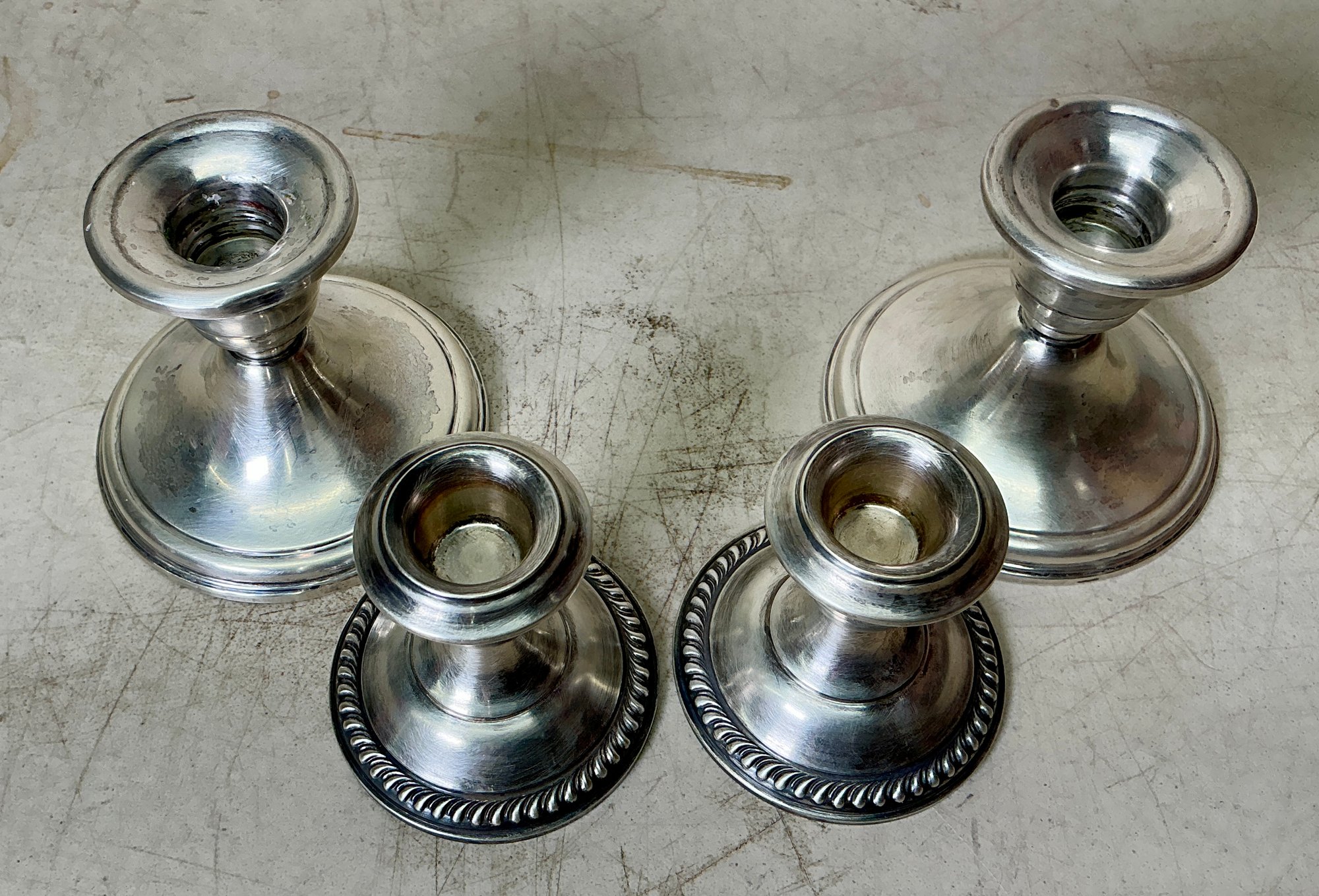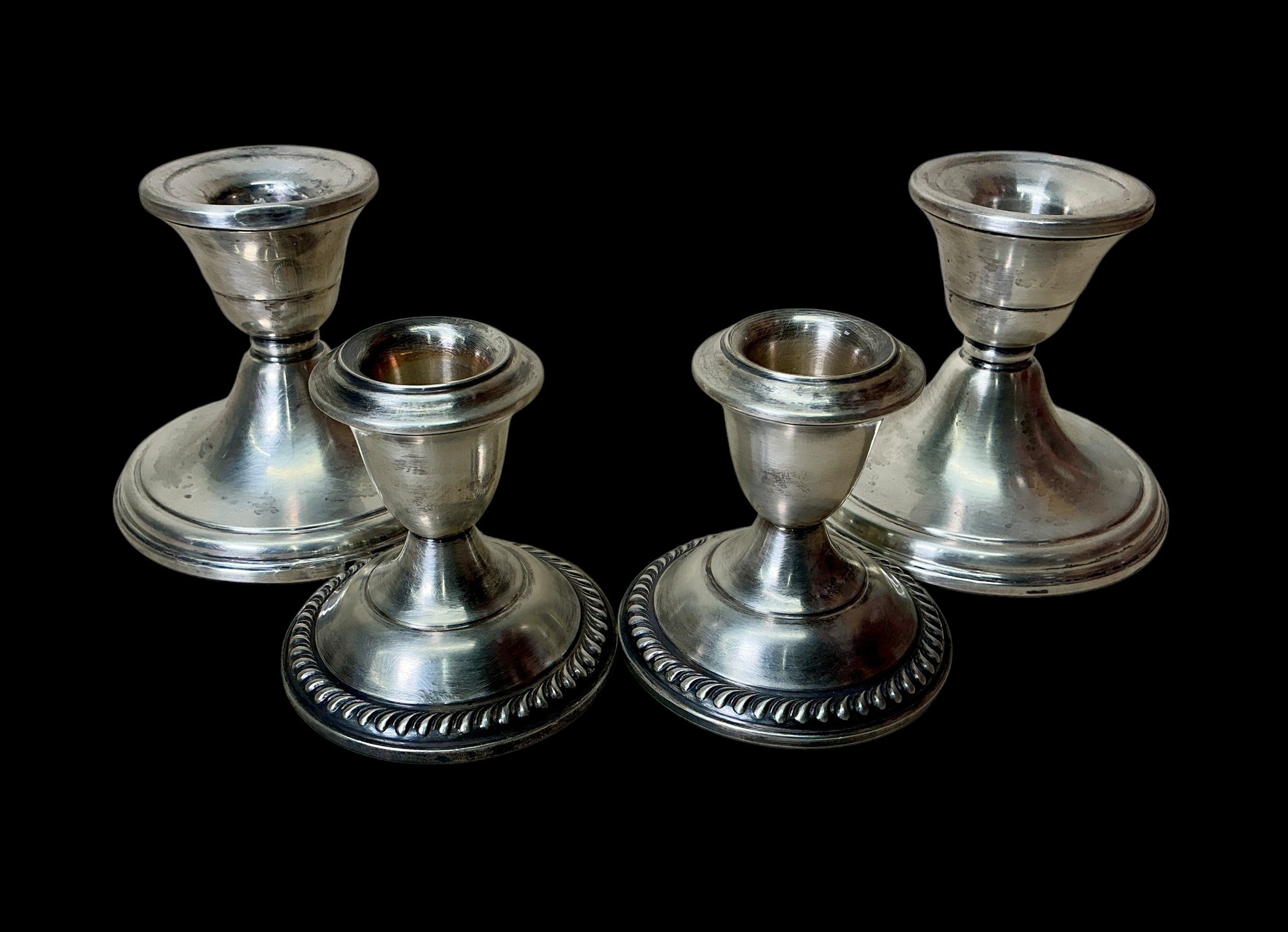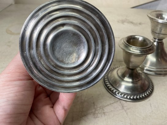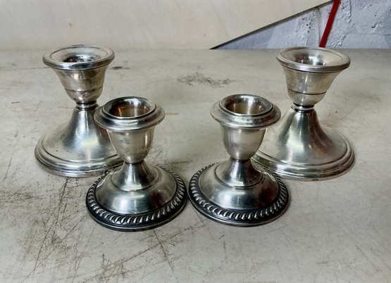 Set Of 4 Sterling Weighted candleholders. See photos for condition. Taller set is 3.35” tall.