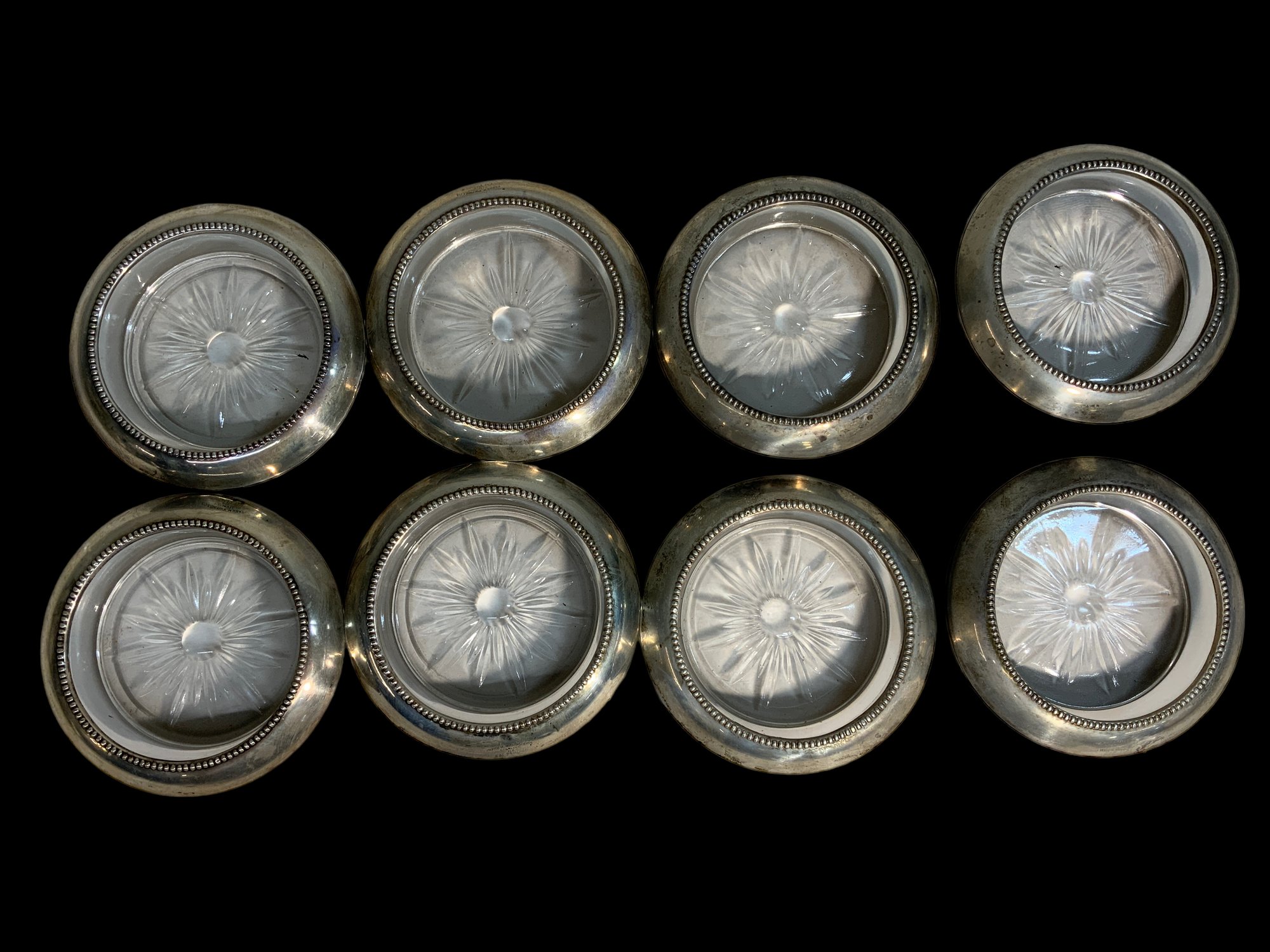 Set Of 8 Vintage Sterling And Glass Coasters. 3.75” diameter.