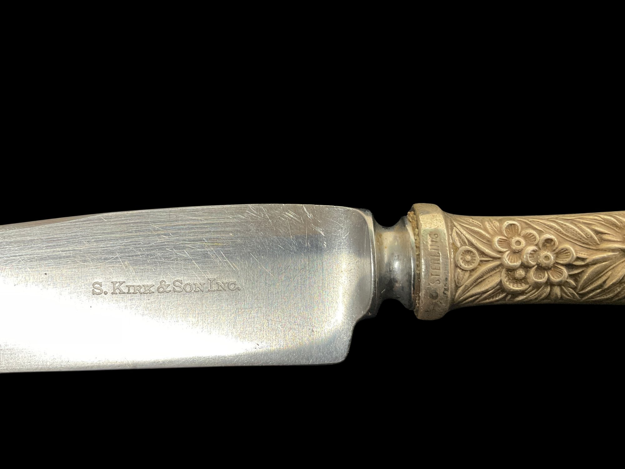 Set Of Six Antique Sterling Handle Kirk And Sons Dinner Knives Floral Pattern. All in good condition. Each is approx. 8.75” long. We counting this at as approximately 3 troy oz because the rule of thumb on sterling handled items is 1/2 ozt per standard handle.