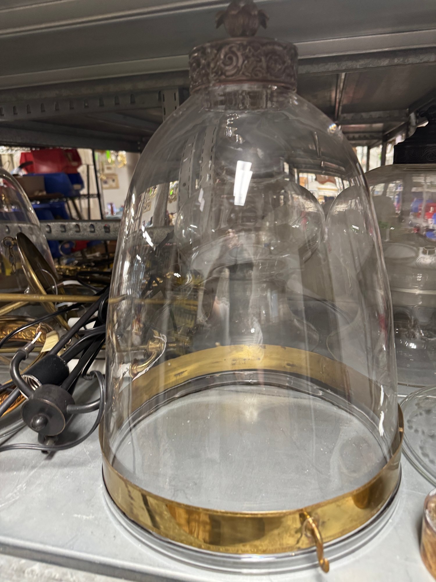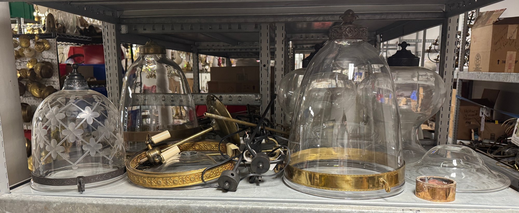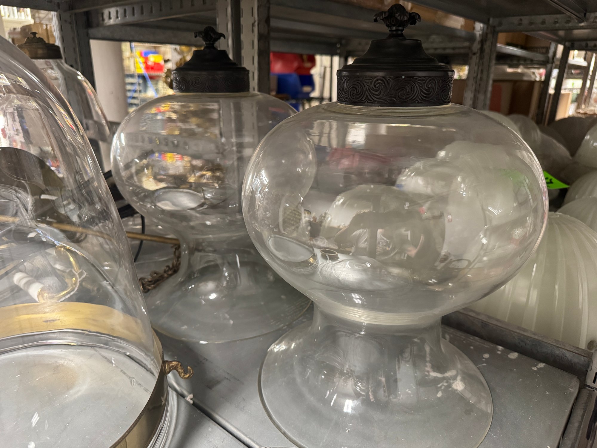 Shelf Full of Large Glass Bell Jar Pendant Light Globes and hardware. We think there's enough to make at least 3 complete fixtures here, but you be the judge. All is in very good condition. Tallest is 14" tall