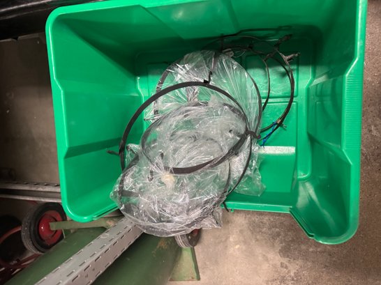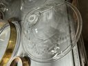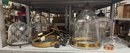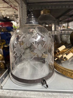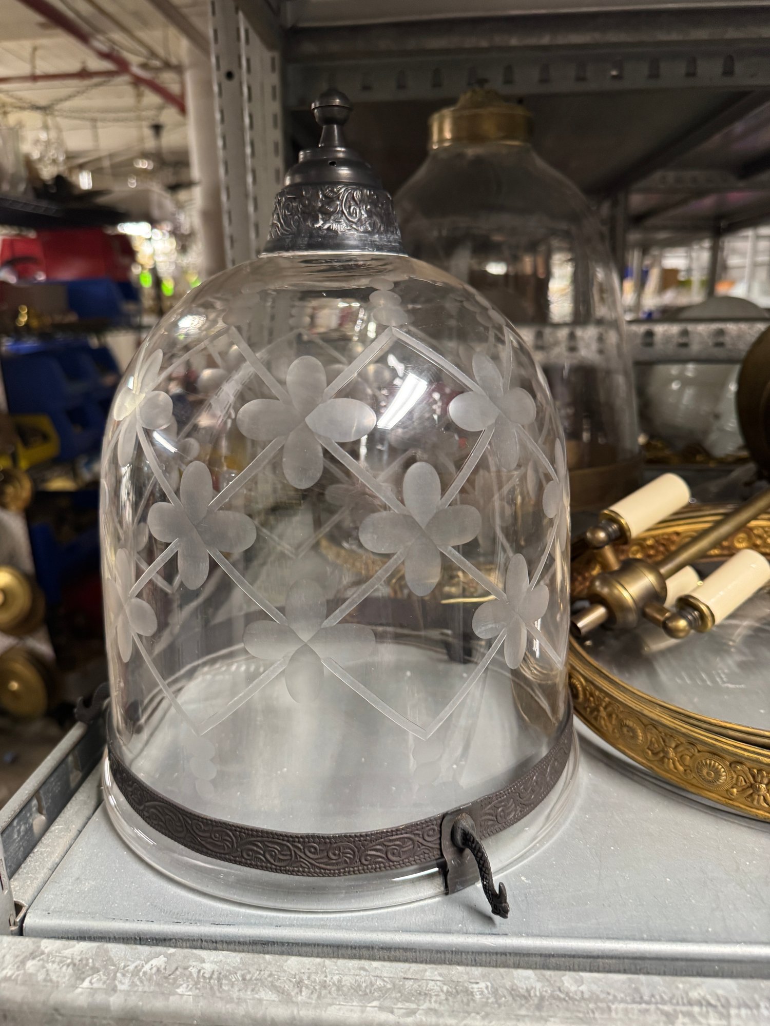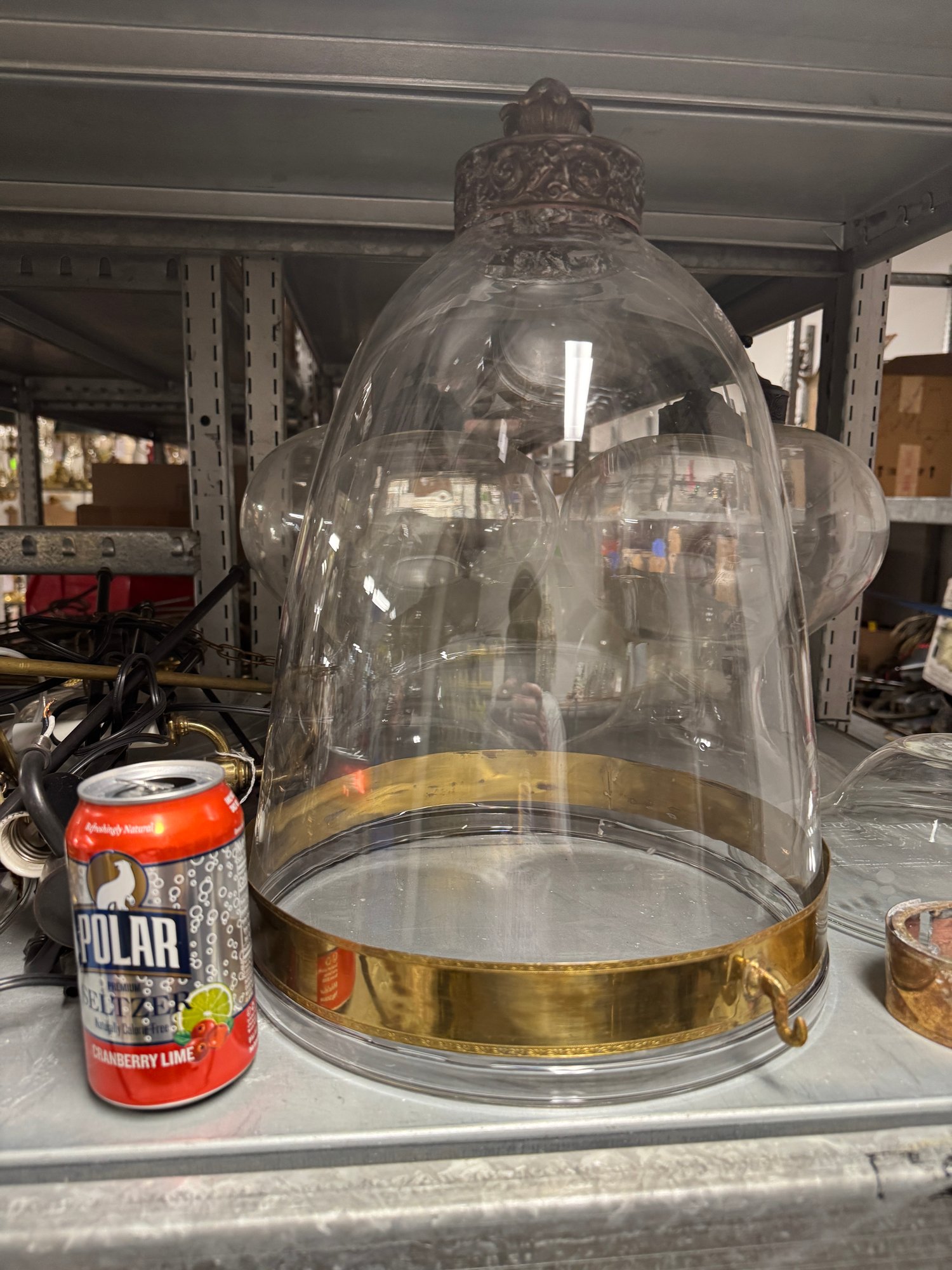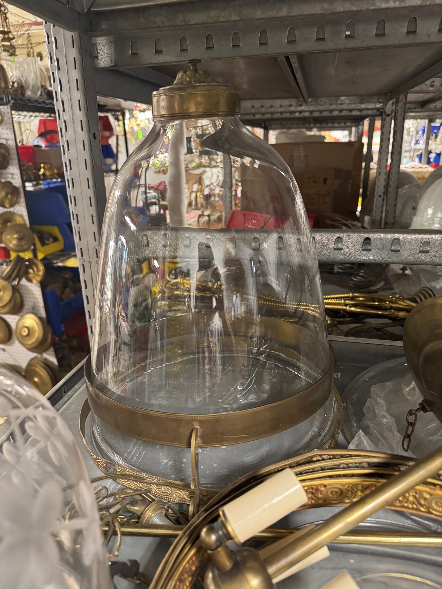 Shelf Full of Large Glass Bell Jar Pendant Light Globes and hardware. We think there's enough to make at least 3 complete fixtures here, but you be the judge. All is in very good condition. Tallest is 14" tall