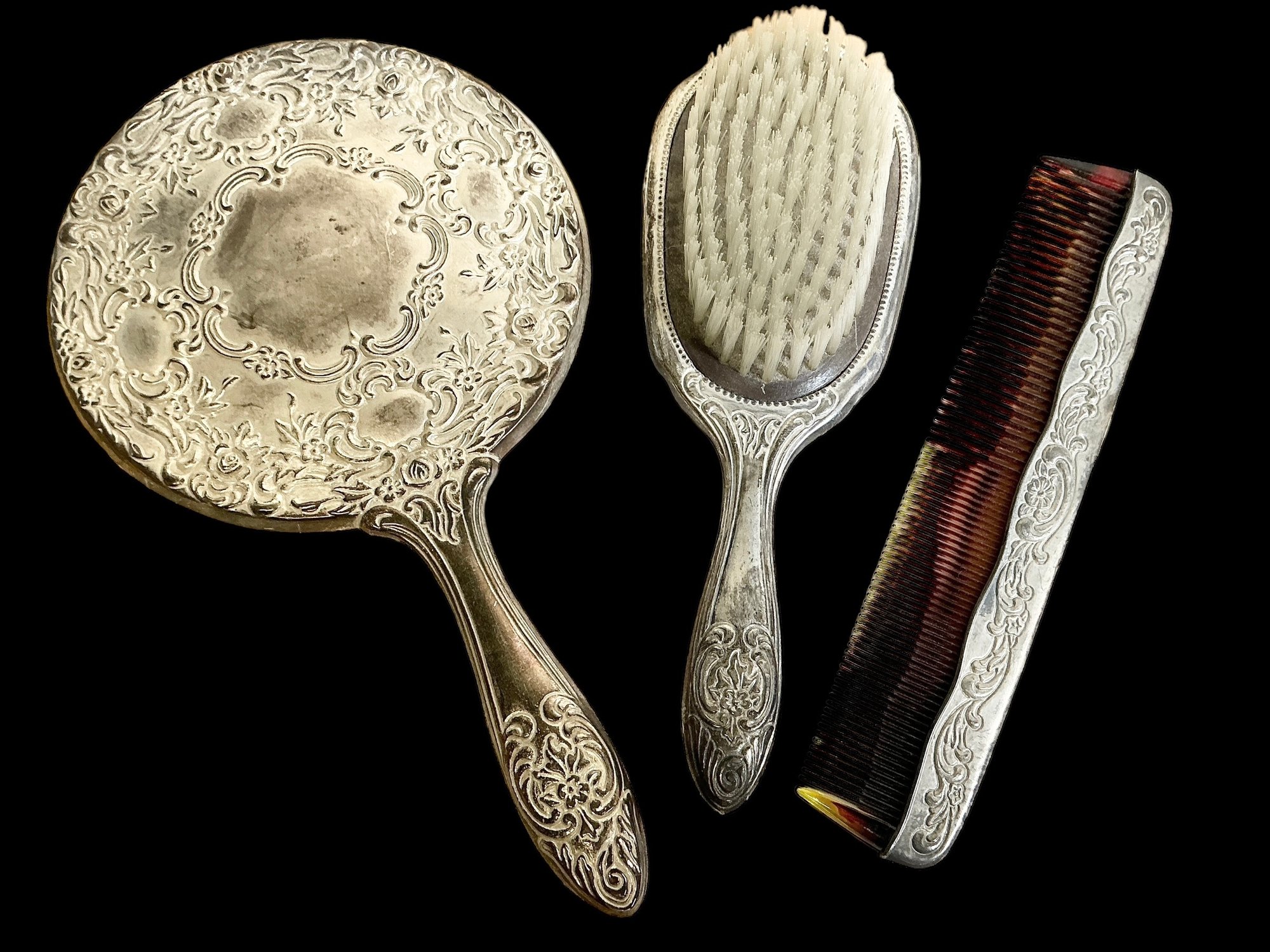 Silver Plate Vintage Vanity Set with Comb Hairbrush and Mirror, all in good condition.