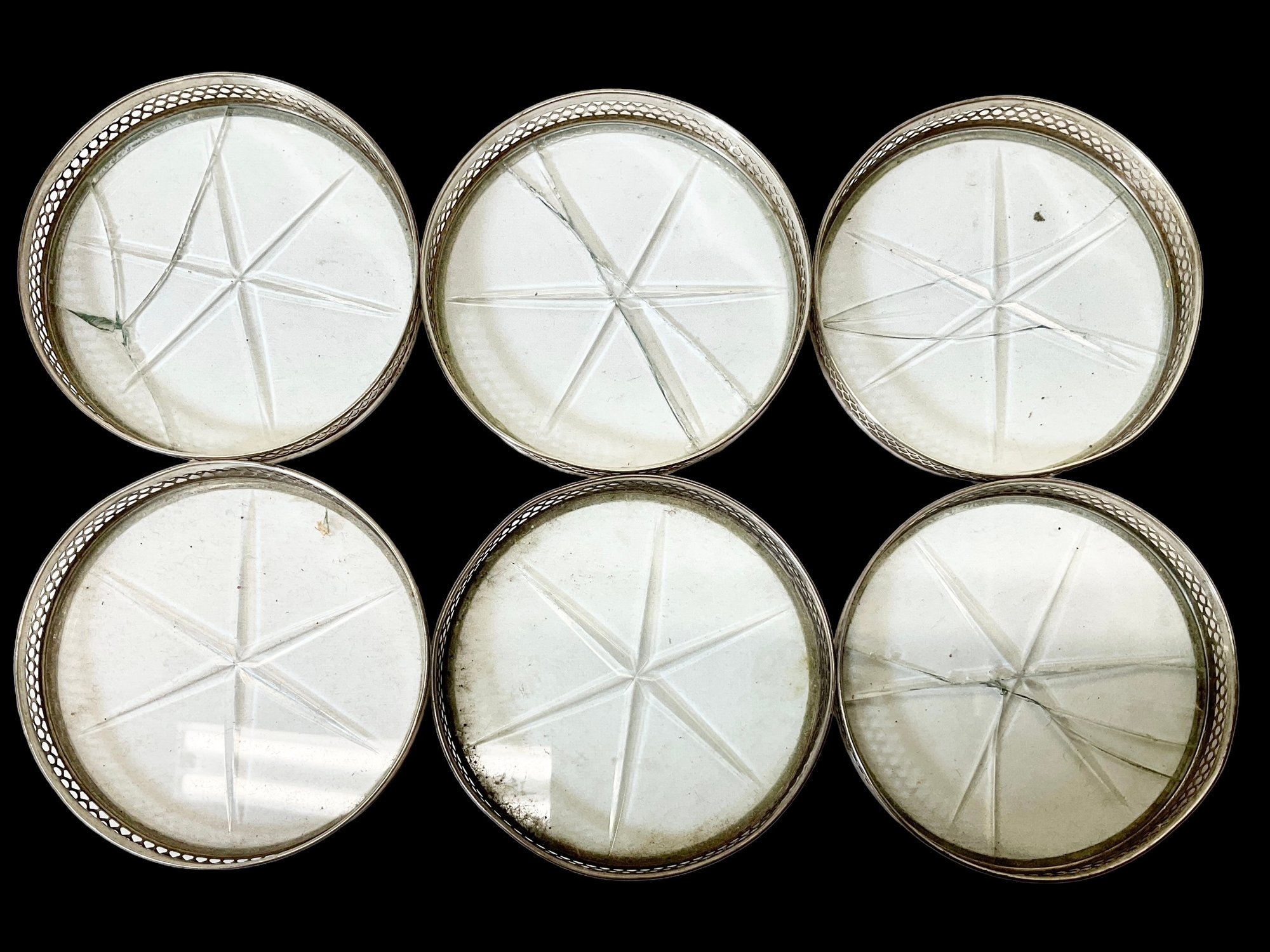 Six Vintage Sterling And Glass Coasters, these measure 3” across, most have major damage to the glass, big cracks. But the rims are all matching. Marked sterling.