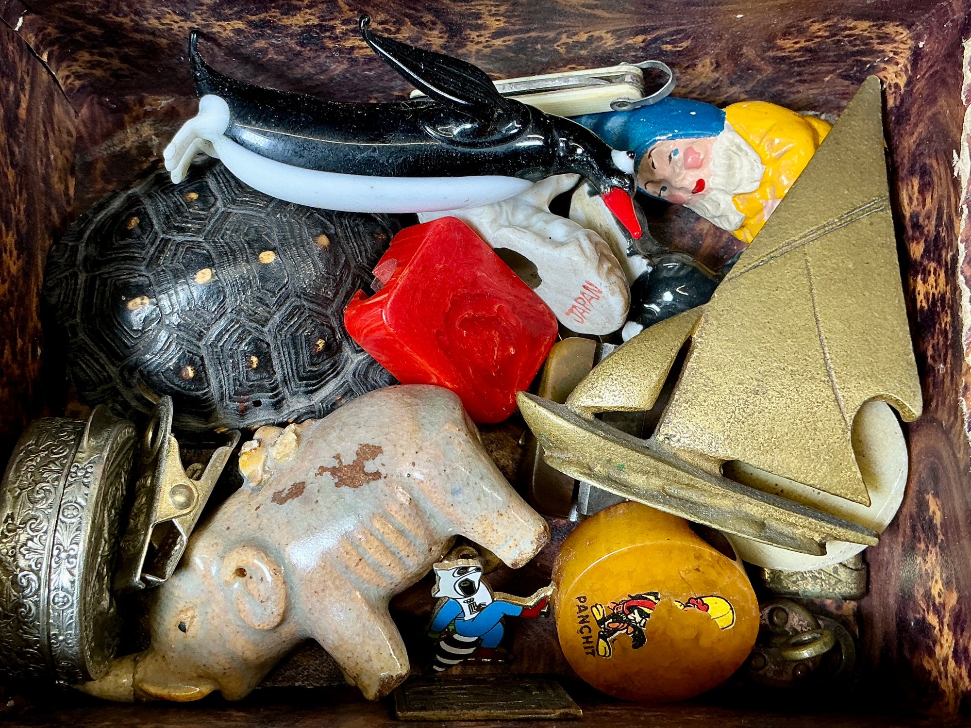 Small Box Full Of Strange Curiosities, box measures 5.5” wide, box is paper over wood, and in poor condition.