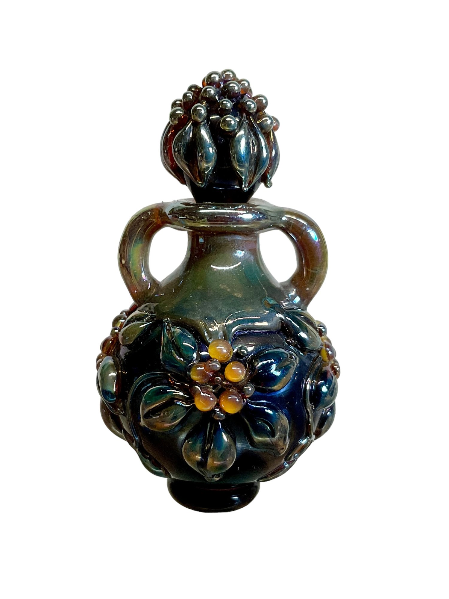 Small Decorative Lamp Work Blown Glass Perfume Bottle, measures 2” tall.