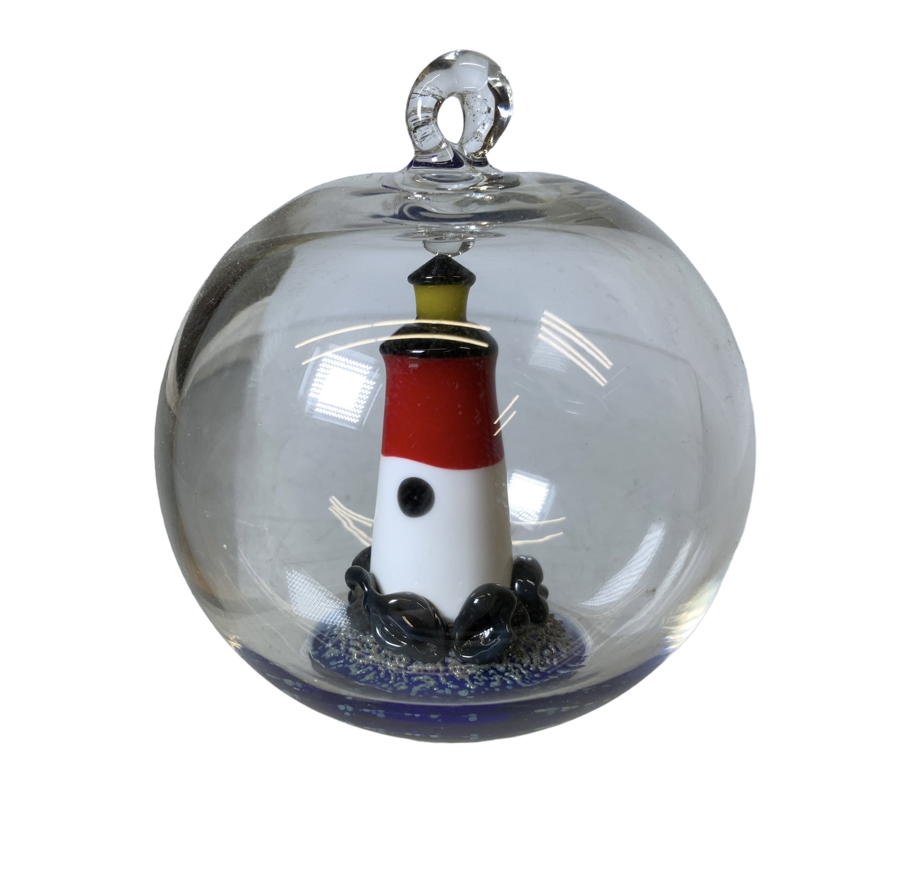 Small Hand Blown Glass Lighthouse Ornament. In very good condition. It is approx. 2.5” in diameter.