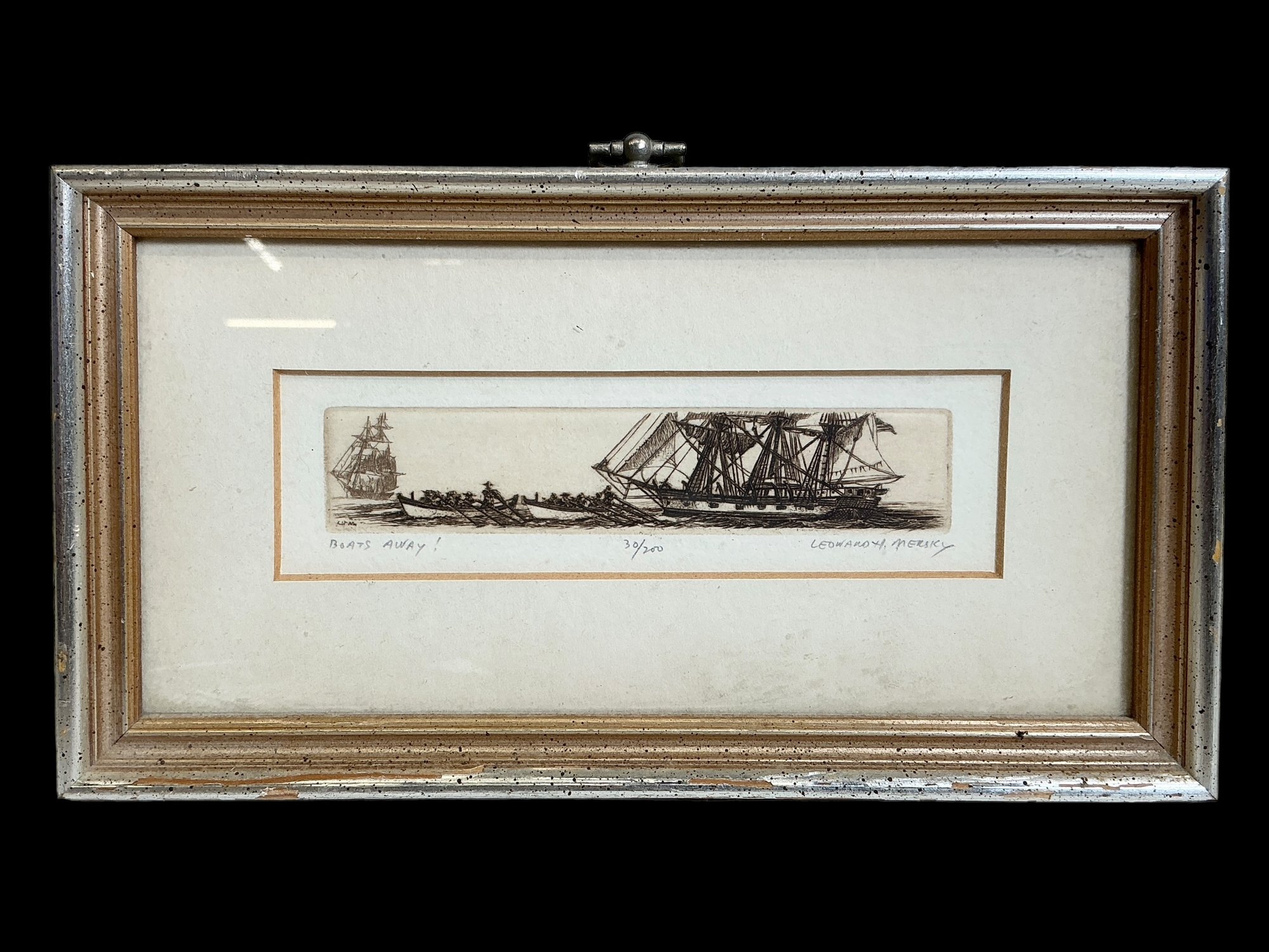 Small Leonard Mersky Etching Titled Boats Away Pencil Signed, measures 5” x 8.5” including the frame.