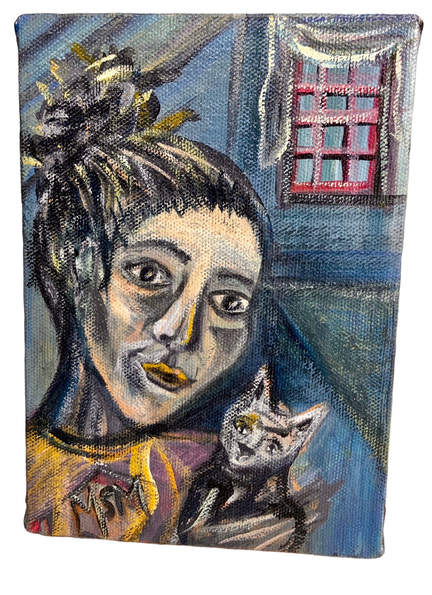 Small Oil On Canvas Of Woman And Cat By Madeleine Murray, signed and dated 8-18. In good condition it measures 5” by 7”.