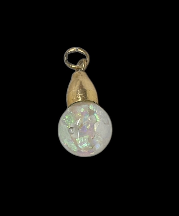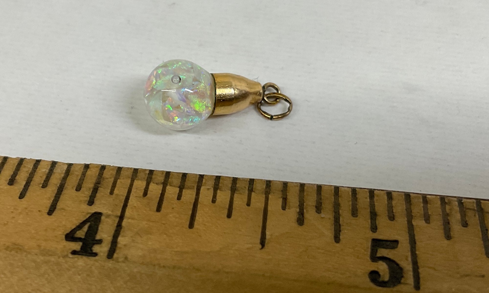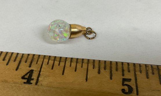 Small Pendant With Opal Chips Suspended In Liquid With A Gold Setting. In good condition. It is approx. 0.5” tall. Not marked but we are believe the setting is gold, but that's not guaranteed.