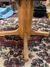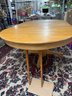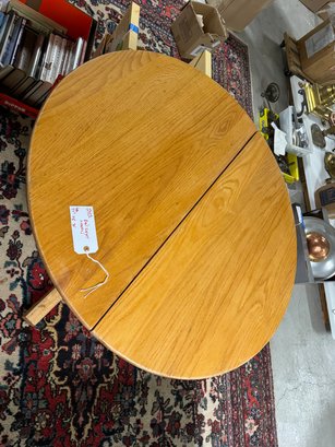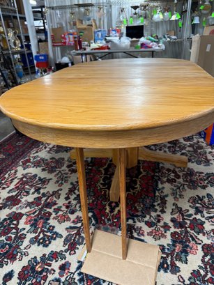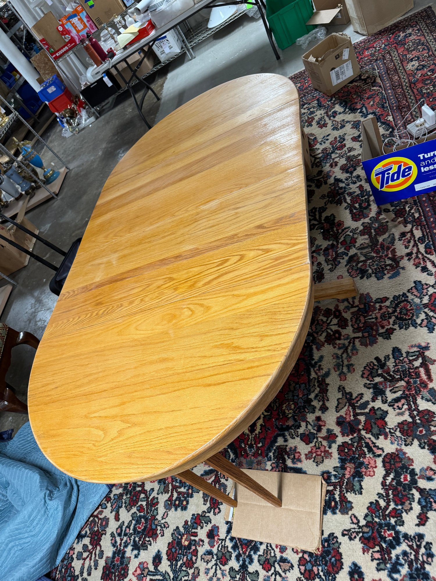 Solid Oak Table with Two Leaves. When extended 77" long, without leaves 42" in diameter, 30" h. Good condition.