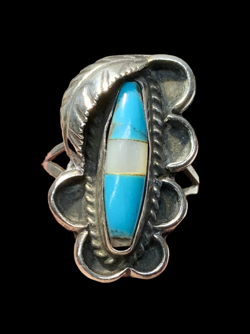 Sterling And Turquoise Native American Ring, there is a repair to one piece of the turquoise stone, that appears to have been fixed with clear resin and polished. See photos. Size 5.75”