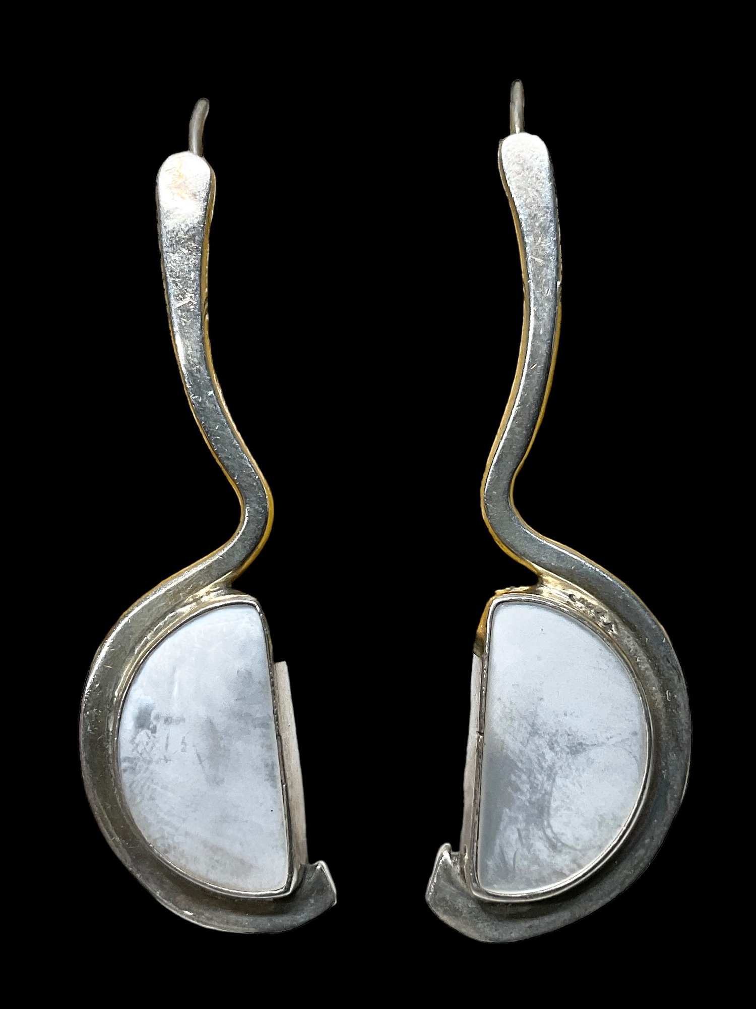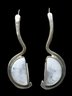 Sterling Drop Hoop Earrings Mother Of Pearl, these measure approximately 2” in length. Marked 925. The Mother of pearl has a satin finish or slight scuff to surface.