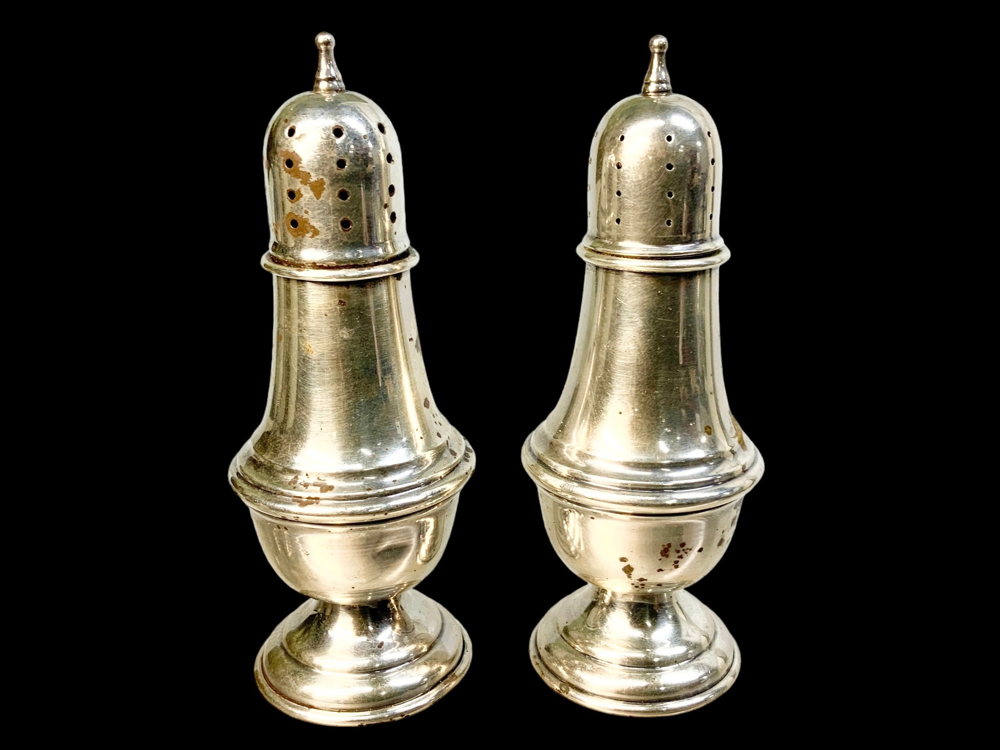 Sterling Silver Vintage Salt And Pepper Shakers, Weighs 48.5 total dwt. These measure 4.5” tall.