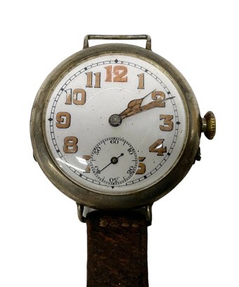 Sterling Silver WWI? Trench Watch Working, Sterling Silver Watch face in working condition, marked inside with London assay office “import” mark, no other maker information that we could detect, but these were often not marked by the mater and were made for soldiers by a number of makers.