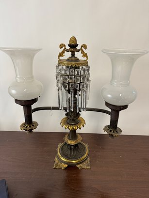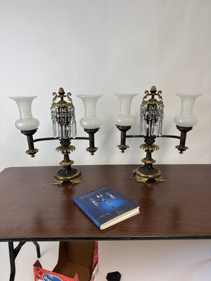 Stunning pair of Victorian, 19th century Ami Argand table lamps with cut glass prisms. They are unwired , but look to be in excellent condition! These are 23" tall