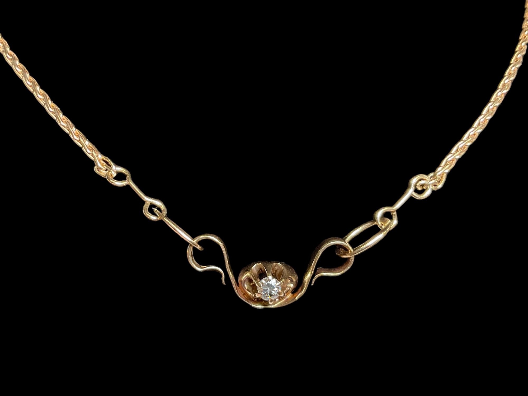 Interesting 14K Gold Necklace Made From Antique Diamond Setting, this necklace looks like someone had an antique engagement ring made into a centerpiece pendant. The total length of the necklace is 18.5.” The necklace clasps in the front. Total weight is 6.89 dwt. Not marked, but tested and guaranteed to be 14K. Very substantial and beautiful hand crafted piece.