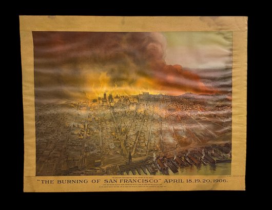 The Burning Of San Francisco 1906 Antique Lithograph By Schmidt Co. Rare large litho in poor condition with wrinkling, staining and the edges have been cut and reattached, please see photos. It is approx. 25.75” by 33”.