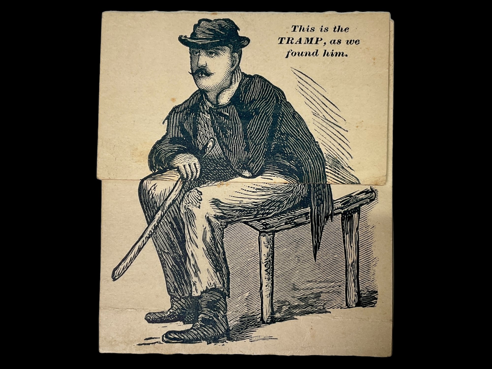 “The Tramp” Victorian Ad Card Tappan Clothing Store in Gloucester MA, measures 7.5” when completely unfolded. Awesome piece of early Gloucester ephemera!