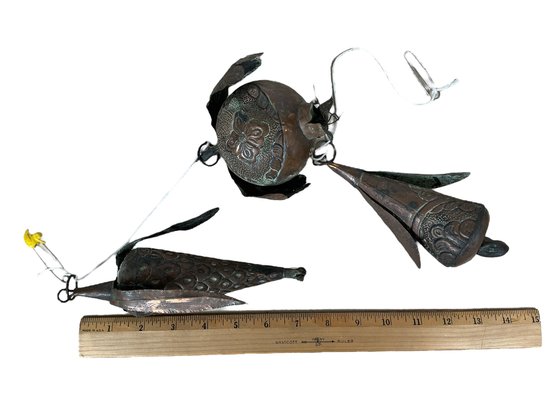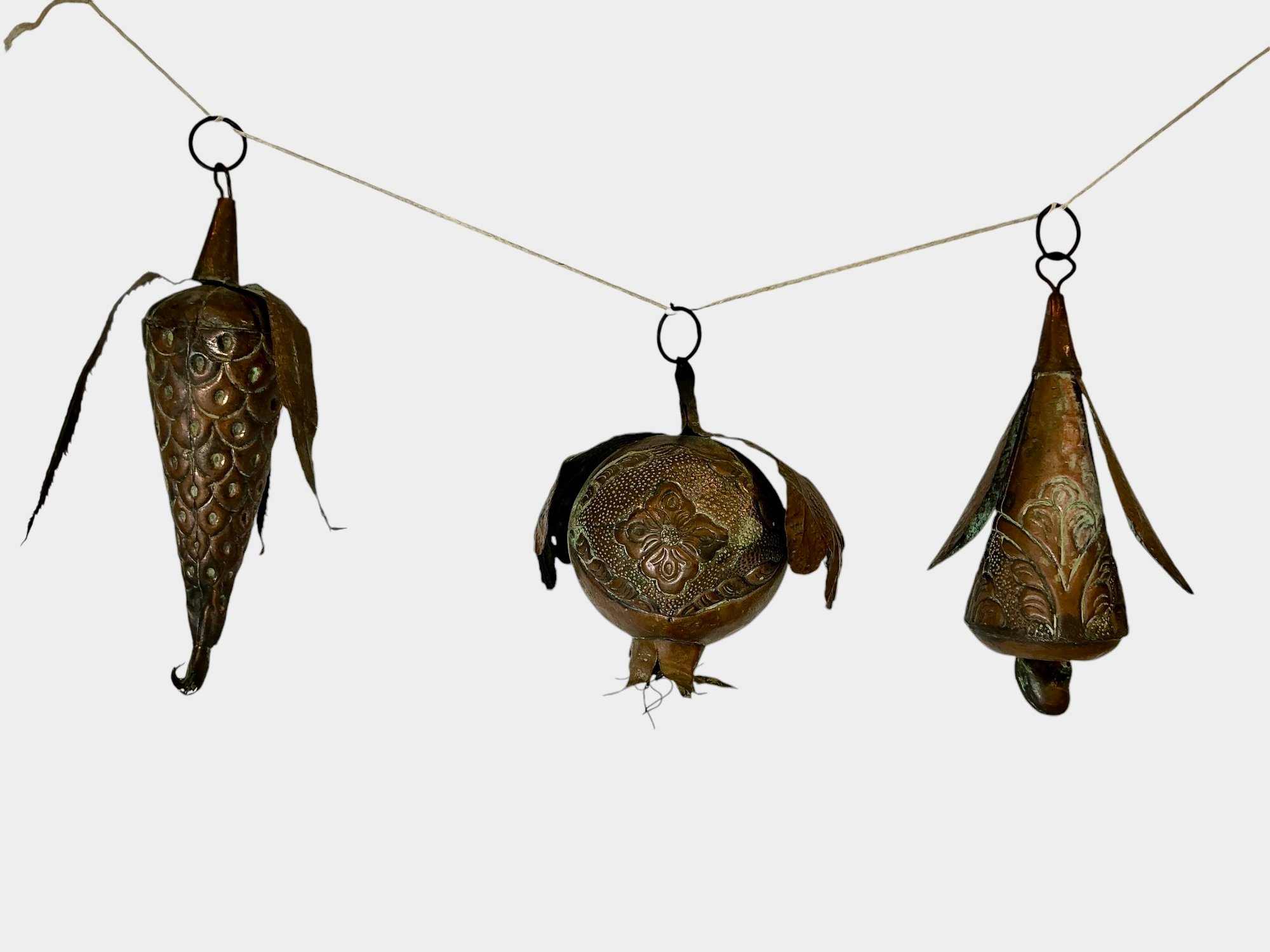 Three Folk Art Decorative Copper Fruit Christmas Tree Ornaments. In good used condition. The largest is approx. 7” long.