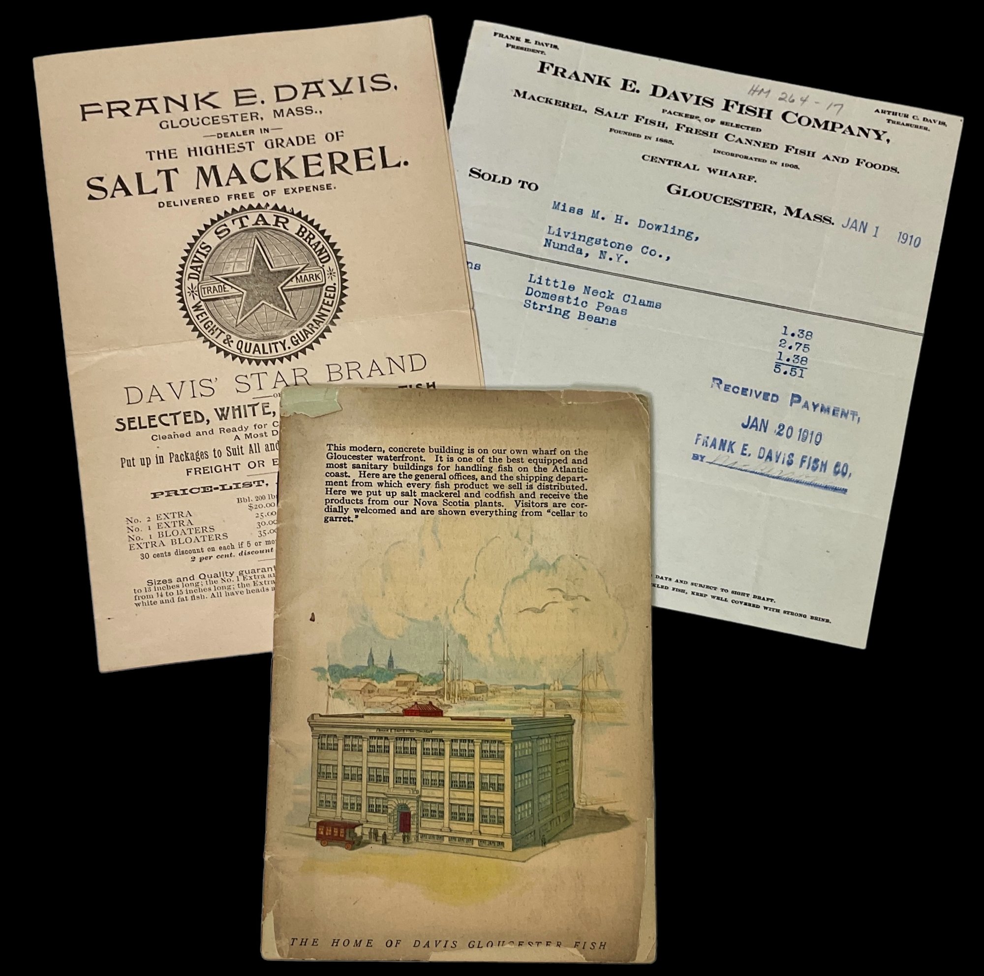 Three Pieces Of Antique Frank E. Davis Fish Co Ephemera Gloucester MA, all in fairly good condition.