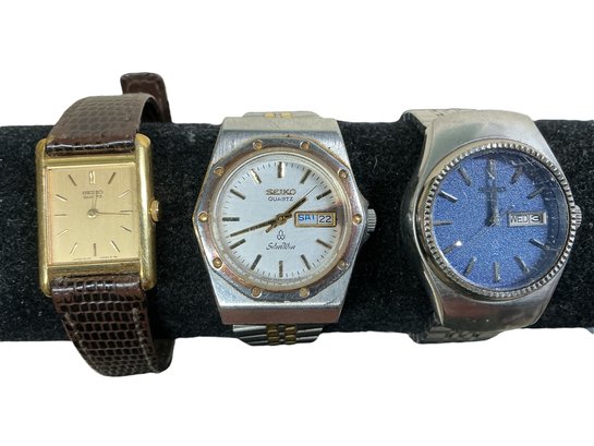 Three Vintage Seiko Ladies Quartz Watches 4303 040 Japanese Silver Wave Etc. All are in good used physical condition but none are currently running. All the crowns pull out and the hands move freely when set.