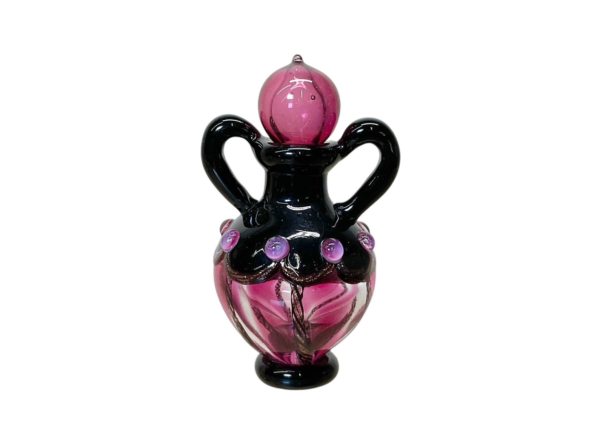 Tiny Blown Glass Pink And Black Lampwork Perfume Bottle, approximately 2” tall.