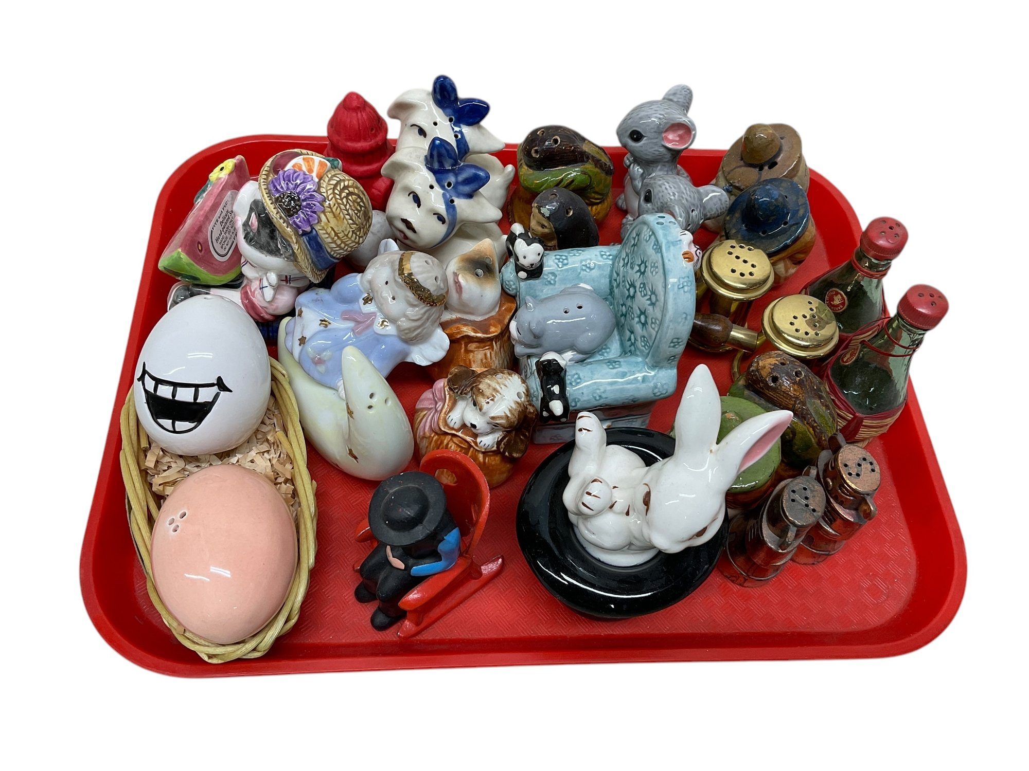 Tray lot of salt and pepper shakers, generally clean and unbroken but some possible small chips, repairs, etc. 16 pairs total. PLEASE NOTE, if you win this lot, you must come prepared with packing materials when you pick them up.