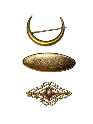 Trio of Antique Gold Pins 10K and 12K, these weigh a total of 2.2 DWT, please be aware that the “Irene” name pin has a gold front only. Largest measures 1.25” wide.