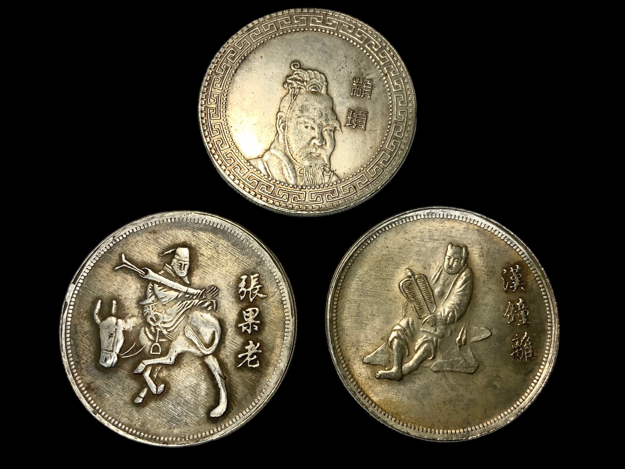Trio Of Chinese Tokens of the Eight Immortals, these are probably made for tourists, but don’t seem modern, probably 1940s-1960s judging by the other coins it was found with. The metal is not tested. These are 1.5” across.