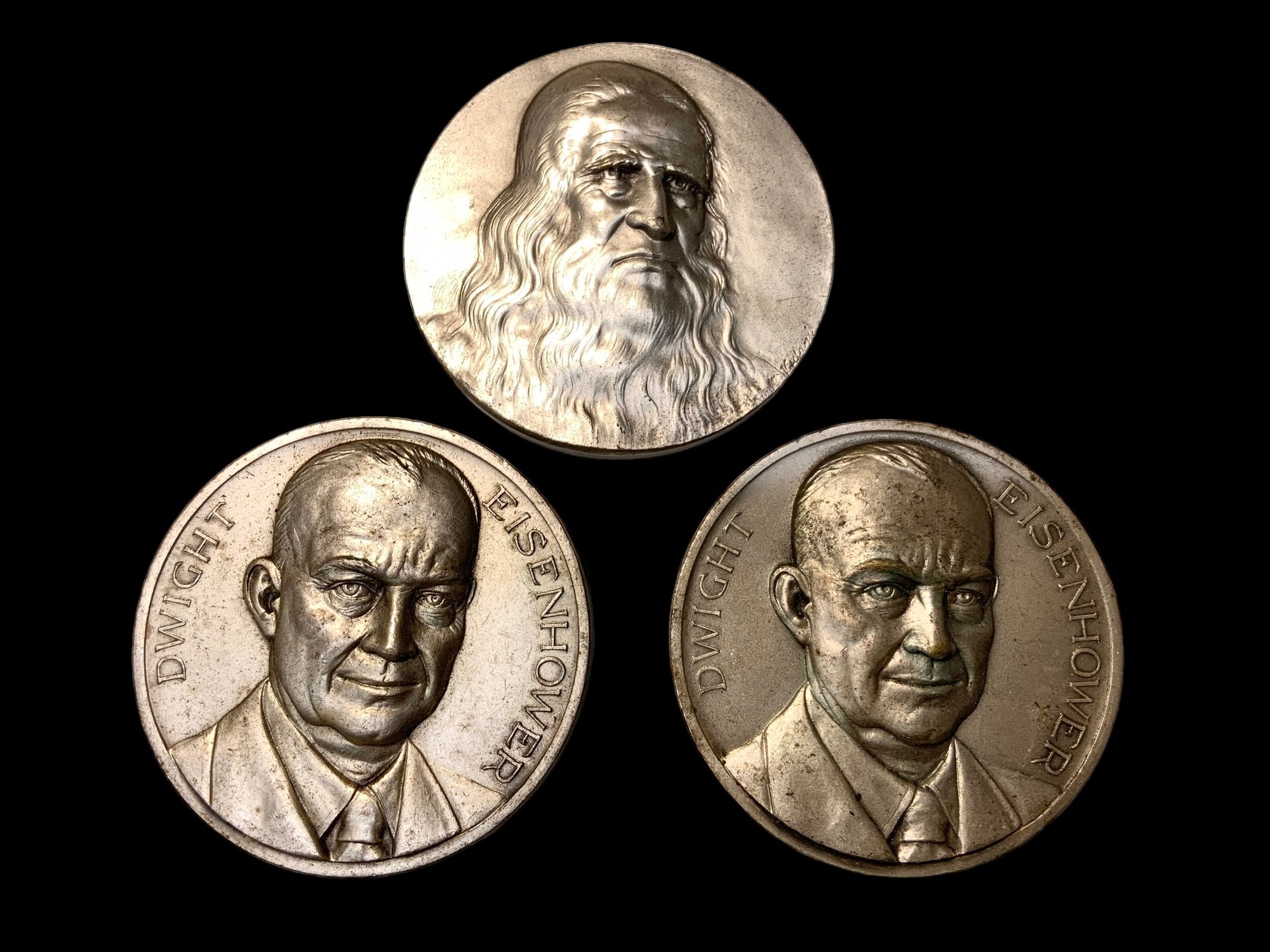 Trio Of Medallions Including Leonardo Da Vinci High Relief Token And two Dwight Eisenhower tokens. These are all 2” in diameter.