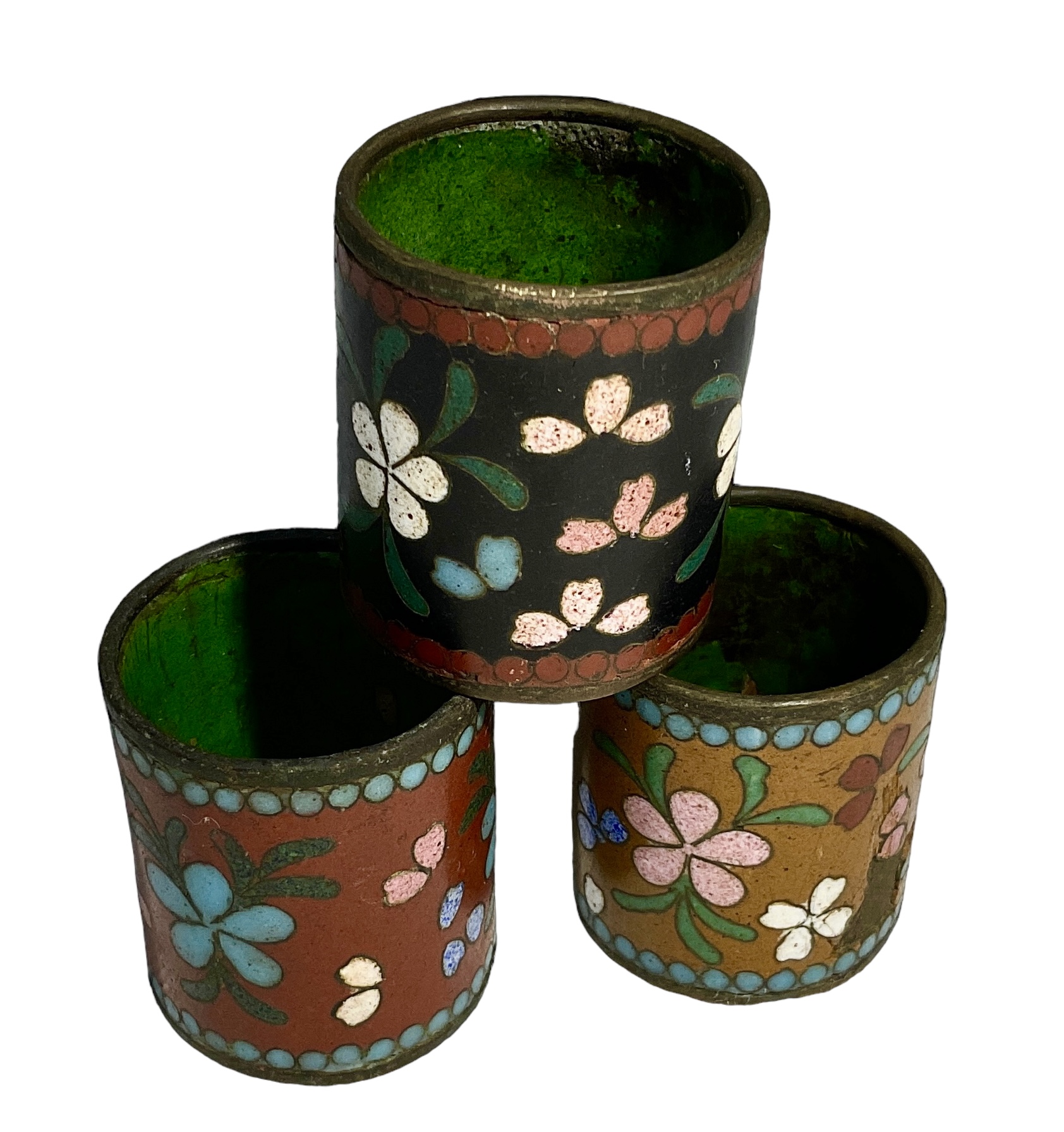 Trio of Small Cloisonne Cups, all 1.5 inches tall. Some small areas of damage to the enamel, see photos.