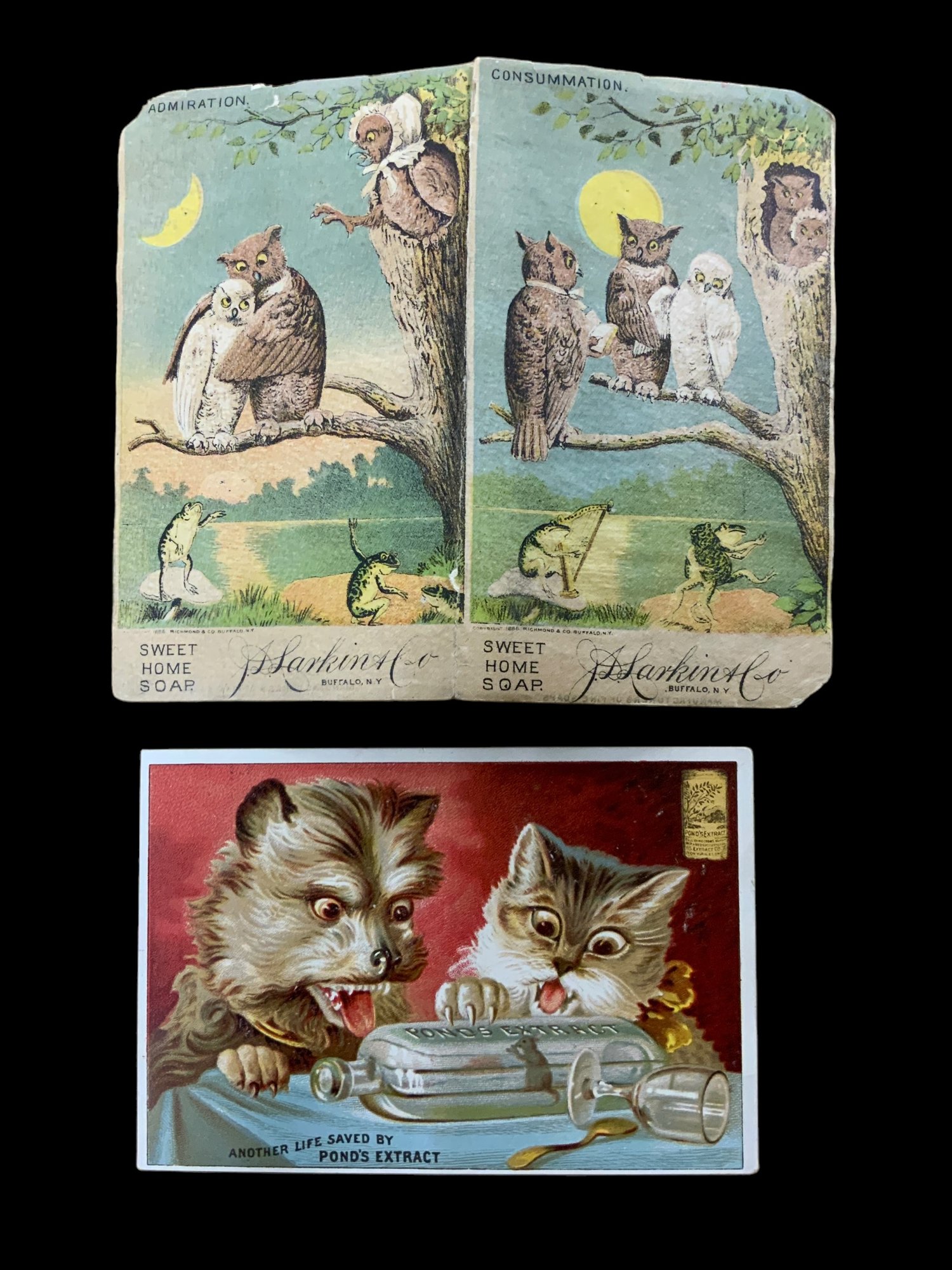 Two Antique Victorian Advertising Cards Featuring Animals, larger one folds in half. Larger is 5” x 3.5.” See photos for condition.